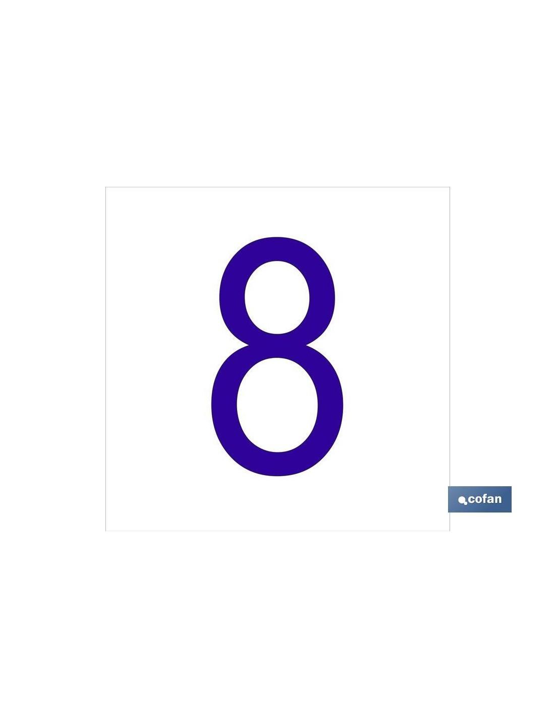8 Número en glasspack adhesivo con el fondo blanco y carácter azul con medida en 62 x 62mm. El diseño de la señal puede variar, pero en ningún caso se variará el significado de la misma.