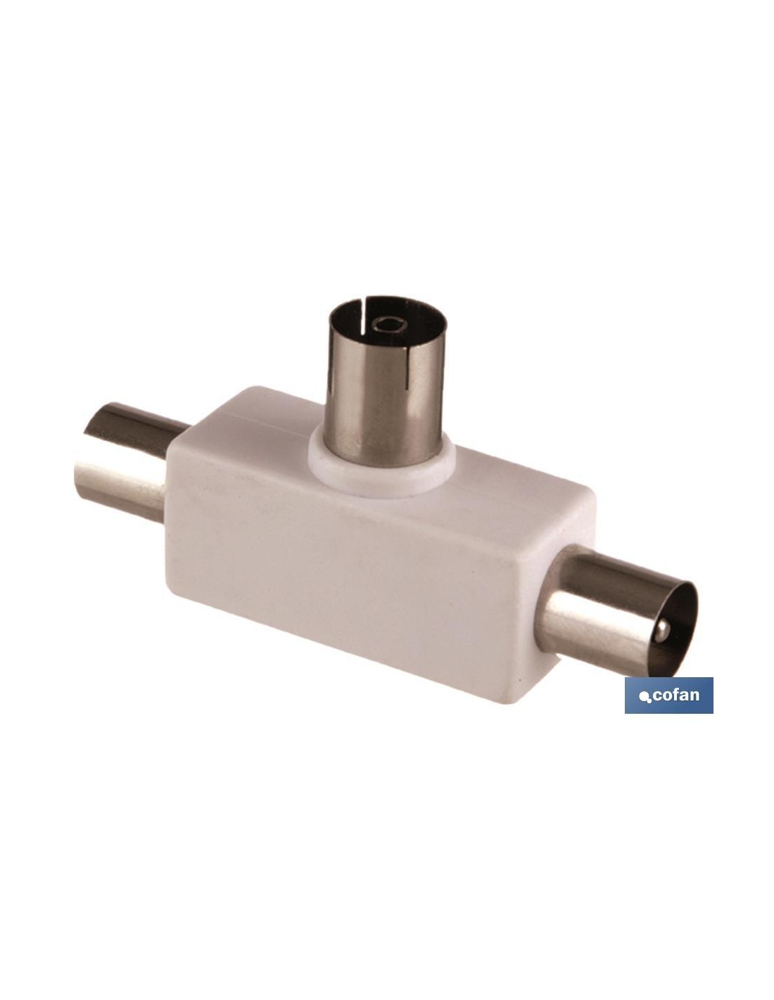 Adaptador coaxial de antena de TV en forma T. Cuenta con 3 conexiones: 1 hembra y 2 machos. Color Blanco. Se utiliza para adaptar el cable de antena a la TV de diversas formas.