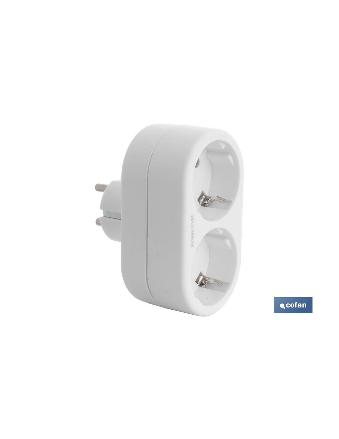Adaptador doble frontal Schuko con 2 puntos de conexión y toma de tierra, 16 A 250 V~. Color blanco. Máxima potencia: 3680 W. Aplicaciones habituales: entorno doméstico o el interior de locales del sector terciario (vivienda, oficinas, comercios, etc.).