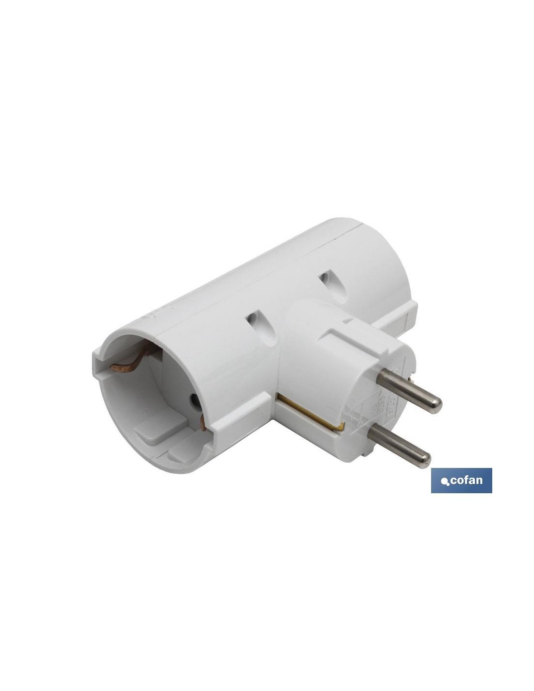 Adaptador doble Schuko con 2 puntos de conexión y toma de tierra, 16 A 250 V~. Color blanco. Máxima potencia: 3680 W. Aplicaciones habituales: entorno doméstico o el interior de locales del sector terciario (interior de vivienda, oficinas, comercios, etc.).