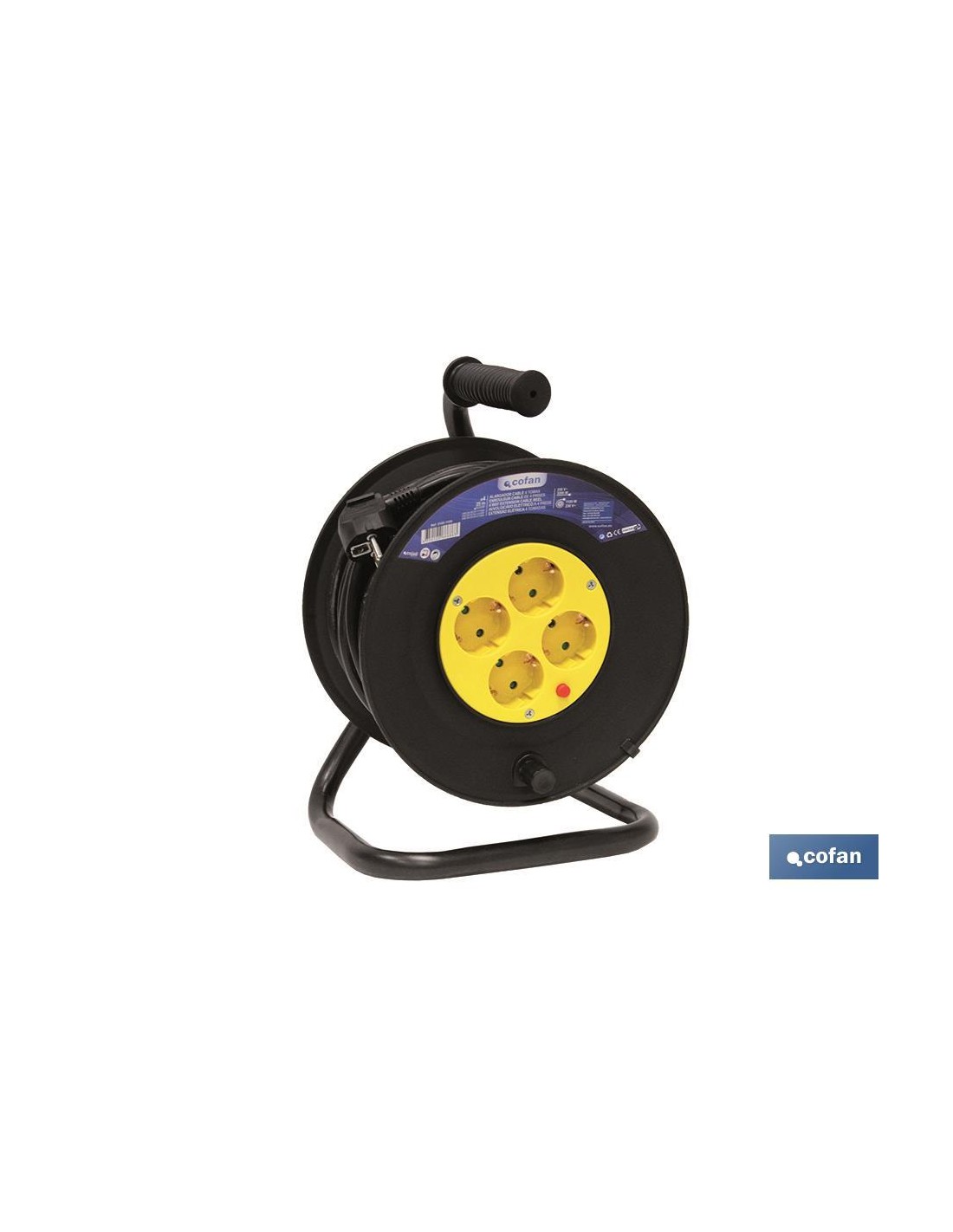 Alargador de cable eléctrico con cuatro tomas o enchufes y 25 metros de longitud. Tambor prolongador provisto de conmutador de seguridad por sobrecarga, seguridad para niños. Prolongador, enrollador de cable de 25 metros de largo y sección de 3 x 1,5mm.