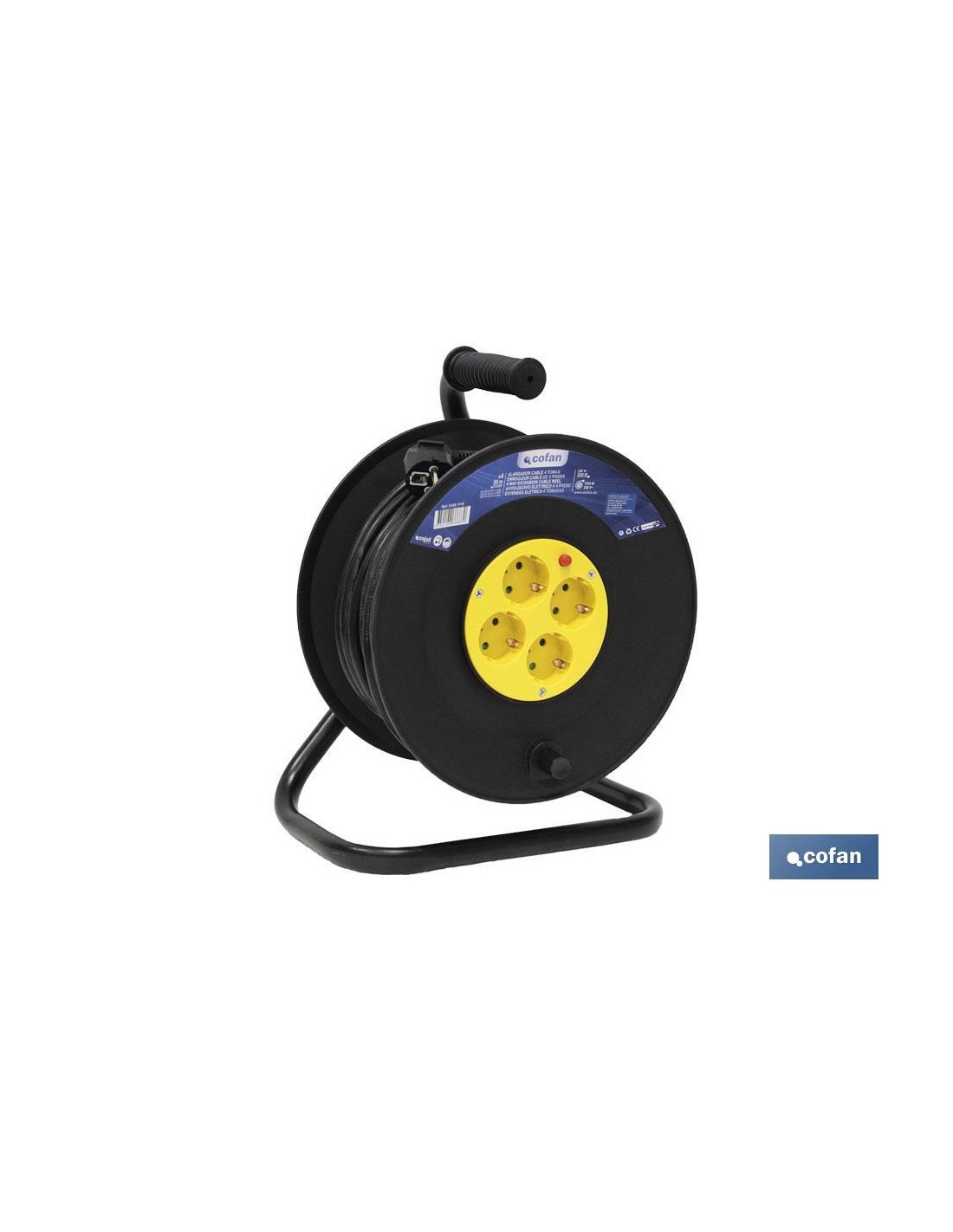 Alargador de cable eléctrico con cuatro tomas o enchufes y 50 metros de longitud. Tambor prolongador provisto de conmutador de seguridad por sobrecarga, seguridad para niños. Prolongador, enrollador de cable de 50 metros de largo y sección de 3 x 1,5mm.