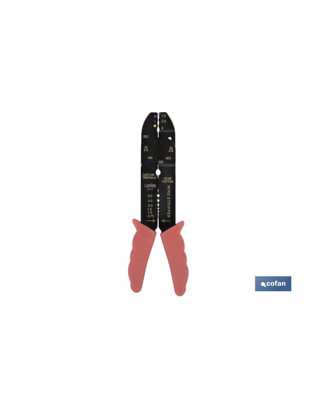Alicates de crimpar prensa terminales para terminales aislados desde 0,75 mm hasta 6 mm. Longitud total: 200 mm. Mango aislante de color rojo. Peso: 175 gramos. Ideales para realizar las funciones básicas de conexión. Su multifuncionalidad permite pelar y unir cables, engastar terminales, engastar conectores…
