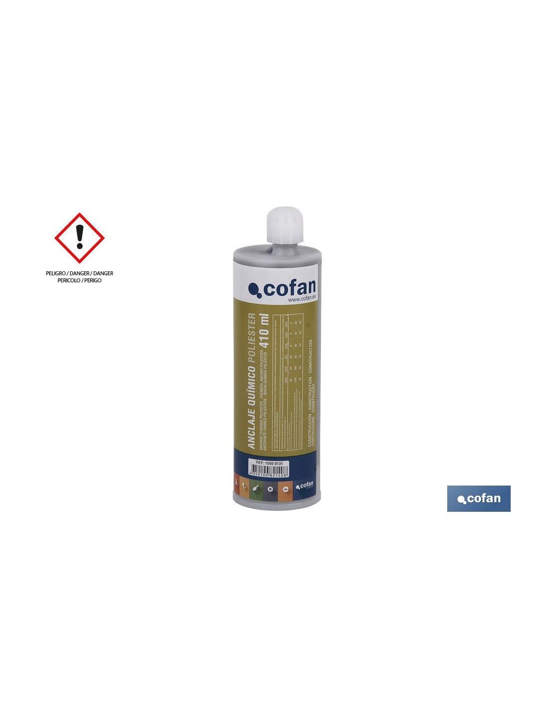 El anclaje químico Cofan posee buena fijación, siendo altamente resistente a grandes cargas. Adecuado para el relleno de huecos y grietas. Apto para ambientes húmedos y extremadamente versátil en albañilería y hormigón aireado. Curado rápido. Poliéster sin estireno. Envasado en formato de 300 ml y 410 ml. Precauciones: Atención contiene viniltolueno, peróxido de benzoilo. Provoca irritación ocular grave. Puede provocar una reacción alérgica cutánea. Evitar respirar el polvo, el humo, el gas, la niebla, los vapores o el aerosol. Lávese las manos tras la manipulación. Lleve guantes, prendas, gafas, máscara de protección. En caso de contacto con la piel lávese con abundante agua. En caso de contacto con los ojos: enjuáguese con agua cuidadosamente. Quitar las lentes de contacto. En caso de irritación o erupción cutánea: Consulte a su médico.