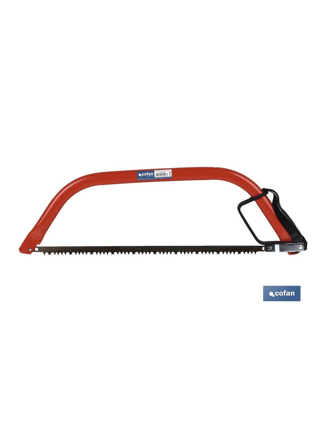 Arco de sierra para madera modelo Protect. Disponible con medidas 21 (533 mm), 24 (610 mm) y 30 (762 mm). Cuenta con un protector y tensor de sierra fabricado en metal. Incluye 1 hoja de sierra para madera verde ya incrustada en el arco. El arco es de color rojo con el mango en negro.
