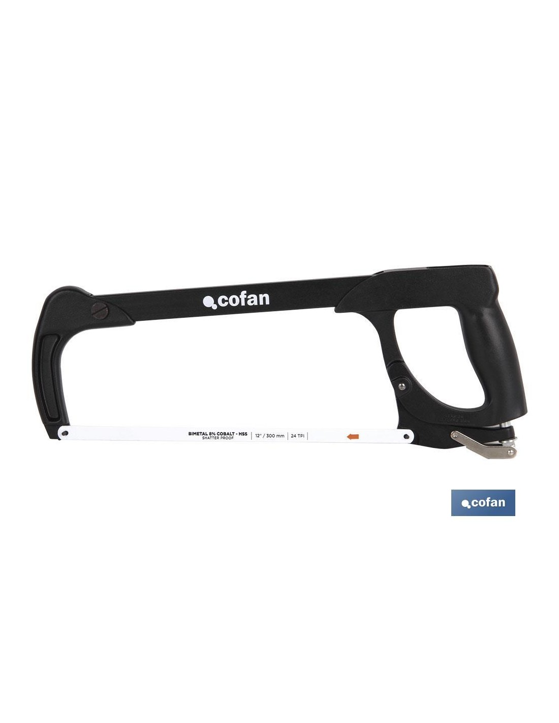 Arco de sierra para madera con tensión ajustable de metal. La medida es de 300 mm. Esta sierra es válida para cortar madera y metal. El arco es de color negro y está fabricado con materiales de muy buena calidad es ergonómico y muy ligero. Es muy fácil de utilizar, manejar y manipular.
