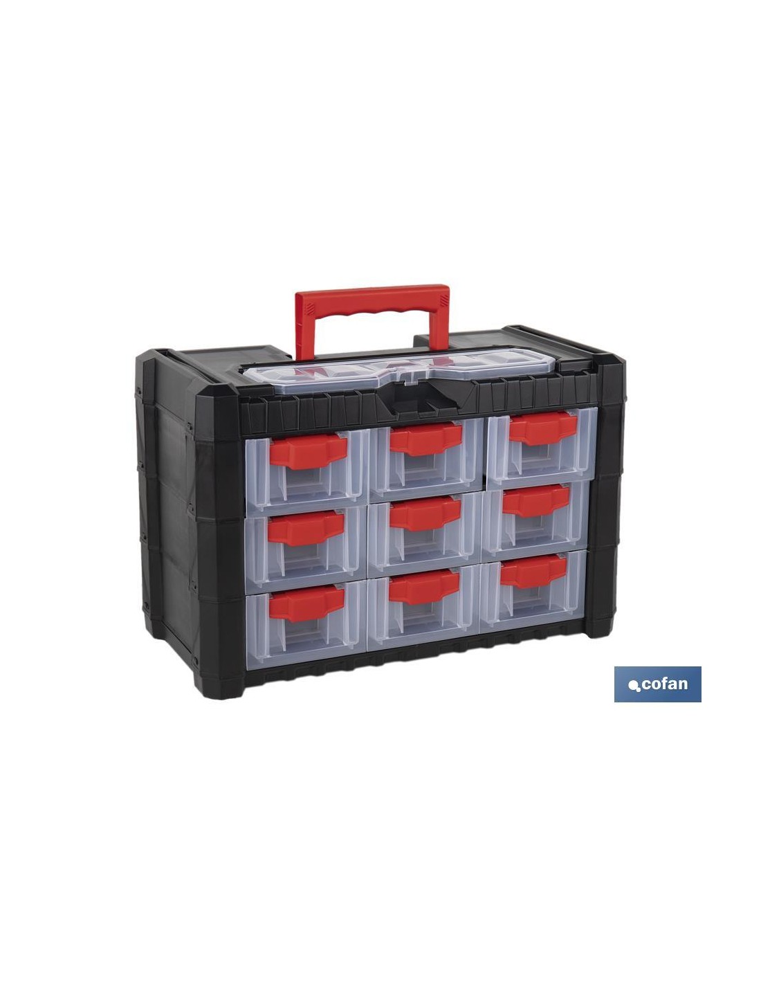 Armario de 9 gavetas para la organización de herramientas y piezas pequeñas, muy útil en un taller, almacén o laboratorio.Diseñado para almacenar un gran número de artículos pequeños en un solo lugar y organizarlos en cajones separados. El armario está equipado con 9 cajones pequeños y organizador en la tapa. Cuenta con cierres para evitar que los cajones se caigan, asa ergonómica para un fácil transporte y orificio para kit de montaje en pared. La carcasa está fabricada de polipropileno de alta resistencia. Dos medidas diferentes de armario: 40 x 20 x 26 cm y 40 x 20 x 39,2 cm.