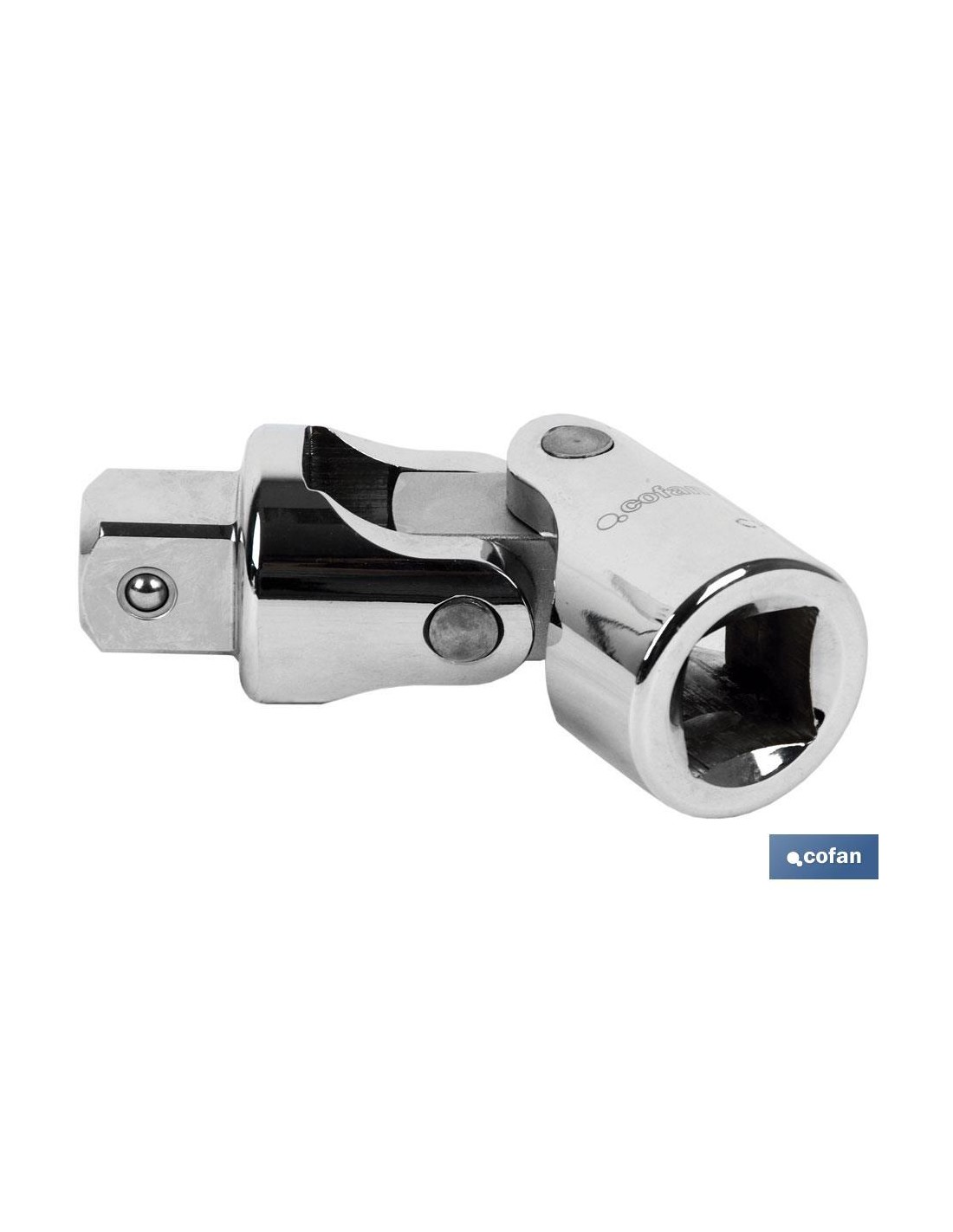 Articulación universal cardán en carraca de 1. Fabricada en acero Cromo Vanadio de alta calidad. Transmite la rotación y par de apriete de los ejes, los cuales pueden estar en un ángulo, inclinación y distancia variables entre sí. Ideal para máquinas de impacto. Pasador accionado por muelle.