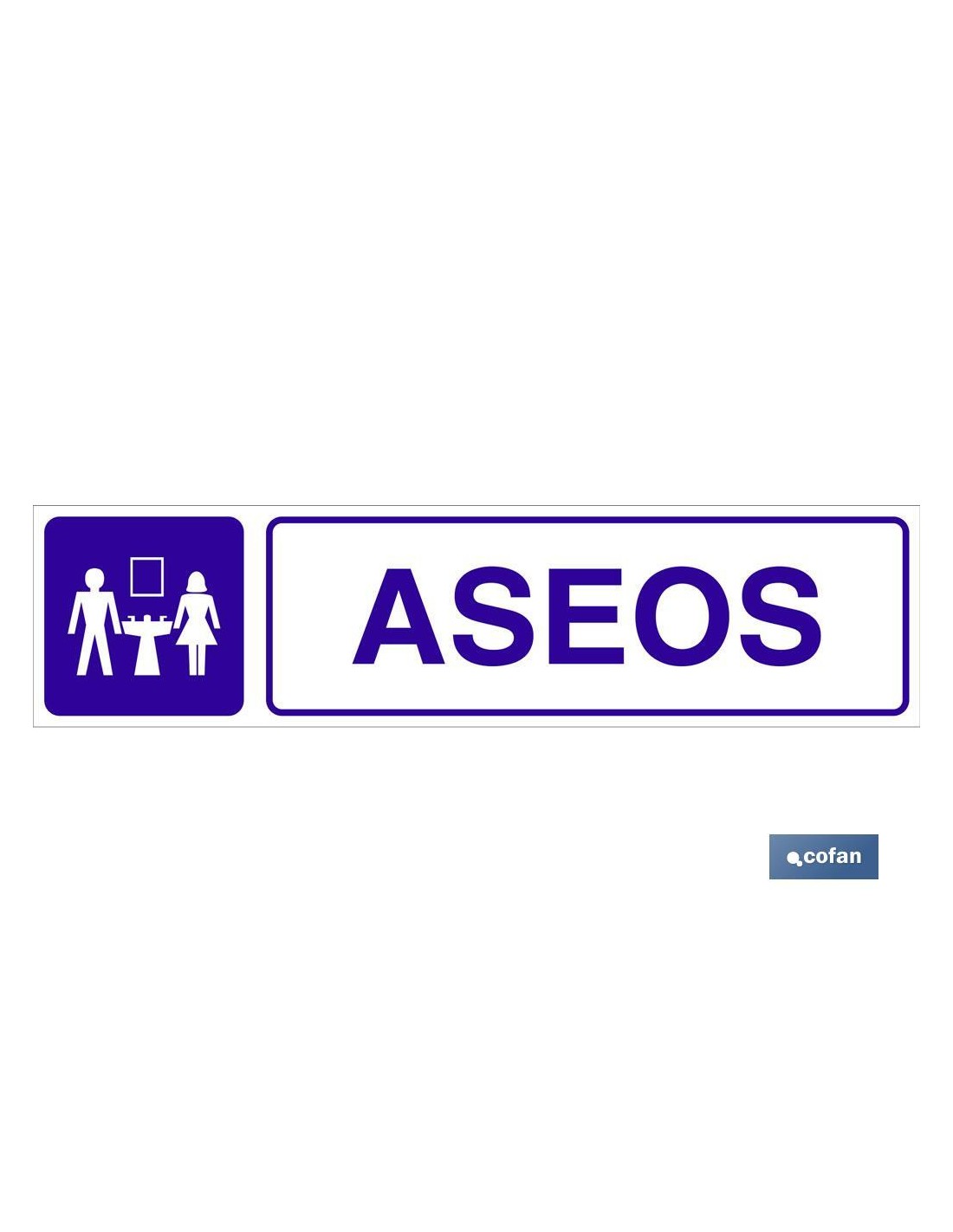 Señal informativa de glasspack adhesiva con imagen y texto de aseos. El diseño de la señal puede variar, pero en ningún caso se variará el significado de la misma.