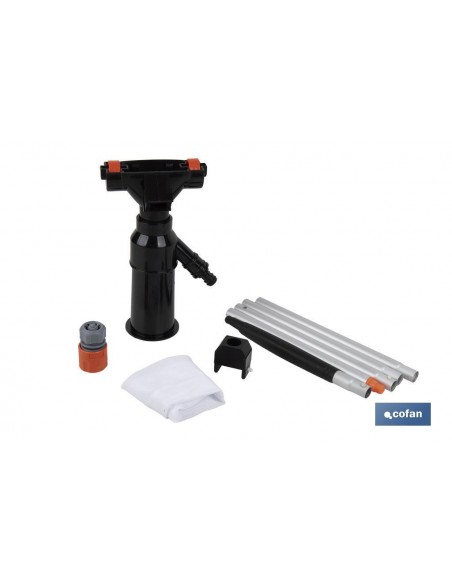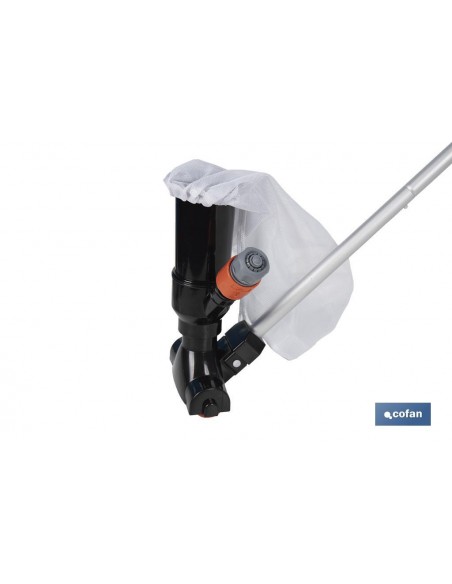 El aspirador para piscinas con pértiga desmontable de 120 cm es la herramienta ideal para conseguir una limpieza rápida y eficiente.Este aspirador para piscina funciona utilizando el principio Venturi, que aprovecha la presión del agua de la manguera para crear succión y recoger la suciedad. Es una solución eficiente y económica, ya que no requiere electricidad.El cuerpo del aspirador está fabricado en ABS de alta calidad, mientras que la pértiga está hecha de aluminio resistente dividida en 5 secciones. Estos materiales aseguran una larga vida útil y un uso prolongado sin desgaste.La pértiga de 120 cm está compuesta por 5 secciones y sistema rápido de clip de 2,8 cm, lo que permite ajustarla a la longitud deseada para llegar fácilmente a todas las áreas de la piscina. Su construcción robusta facilita el manejo y la maniobrabilidad.Incluye una bolsa de malla que se utiliza para recoger suciedad, arena y otros residuos pequeños del fondo de la piscina. La bolsa es fácil de vaciar y reutilizar, haciendo la limpieza más sencilla.Este aspirador es muy fácil de montar y utilizar. Simplemente conecta la manguera de jardín, ajusta la pértiga a la longitud deseada y comienza a limpiar. Su diseño intuitivo permite una limpieza rápida y sin esfuerzo.Dimensiones del Aspirador: 23 cm de alto y 13,5 cm de ancho.Instrucciones de uso: Ensambla las secciones de la pértiga hasta alcanzar la longitud deseada. Conecta la manguera de jardín al aspirador. Coloca el aspirador en el fondo de la piscina y deja que el sistema Venturi cree succión para recoger la suciedad. Retira la bolsa de malla, vacíala y enjuágala con agua limpia. Vuelve a colocarla para el próximo uso.