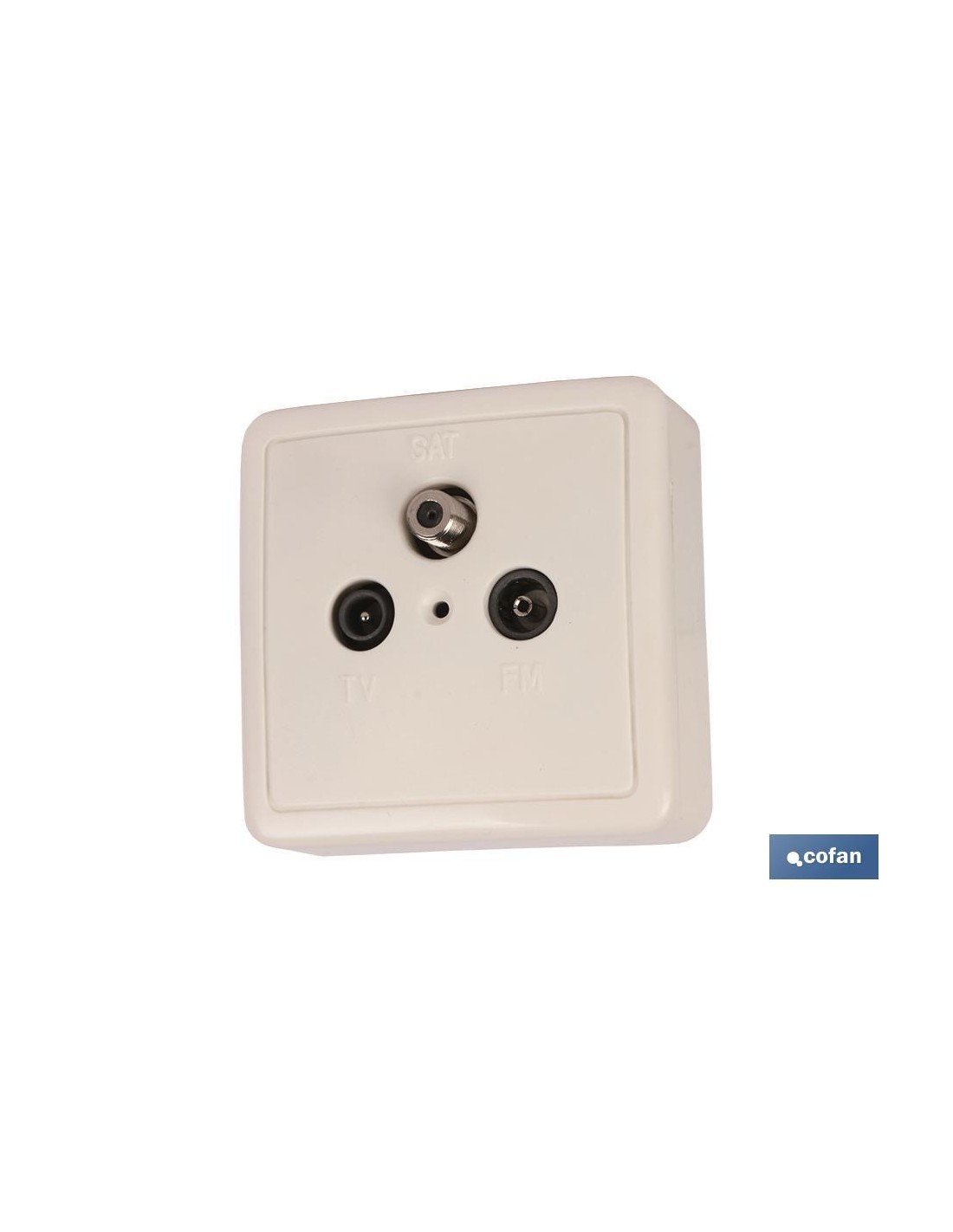 Base cuadrada en superficie para toma de Antena TV. Apto para 1 toma conexión Hembra y 1 macho y 1 toma vía satélite. Color Blanco.