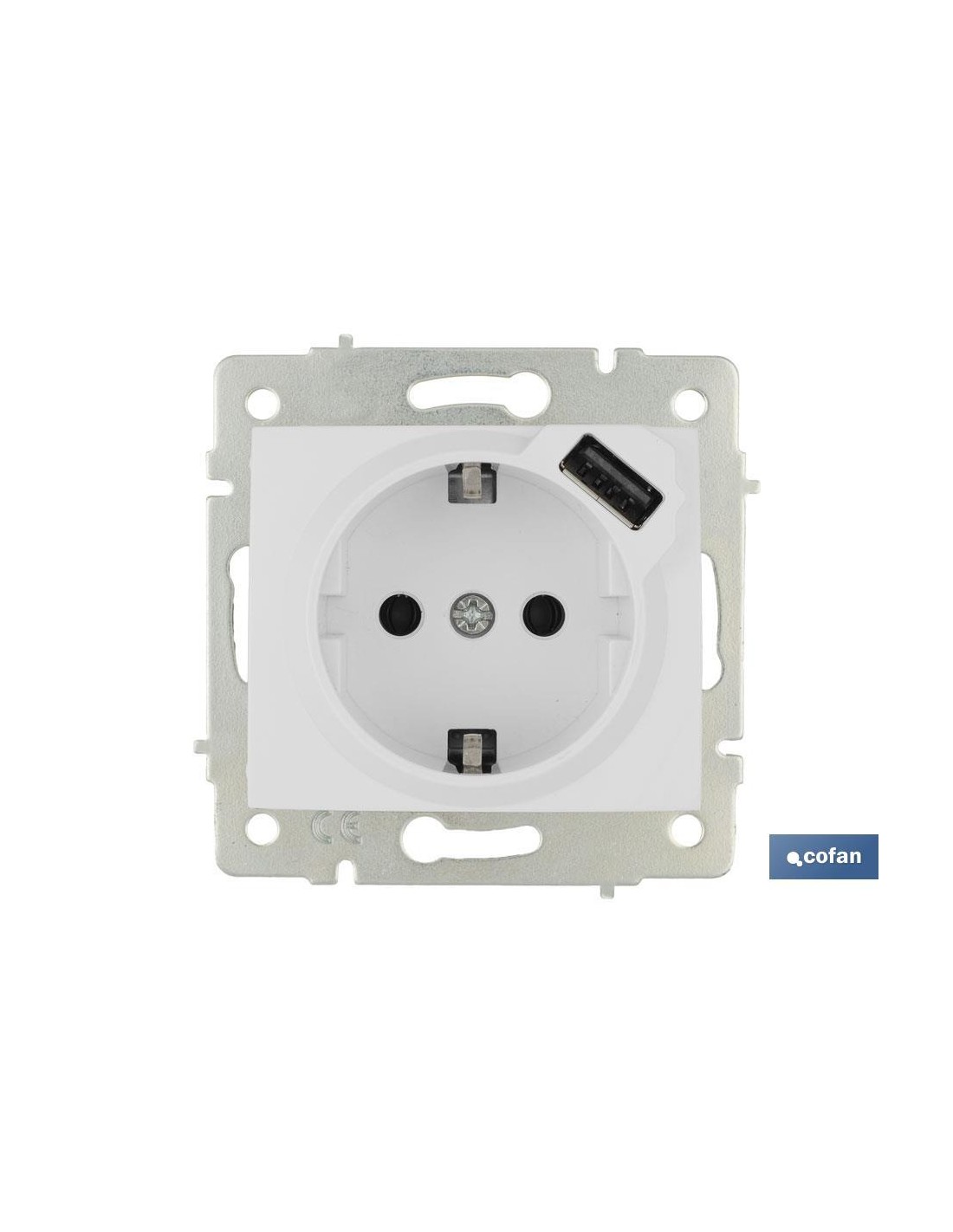 Base bipolar para enchufe de 2 P + T con obturador y entrada a un puerto USB. No lleva marco del mecanismo de empotrar. 16 V - 250 V. Modelo Pacific.