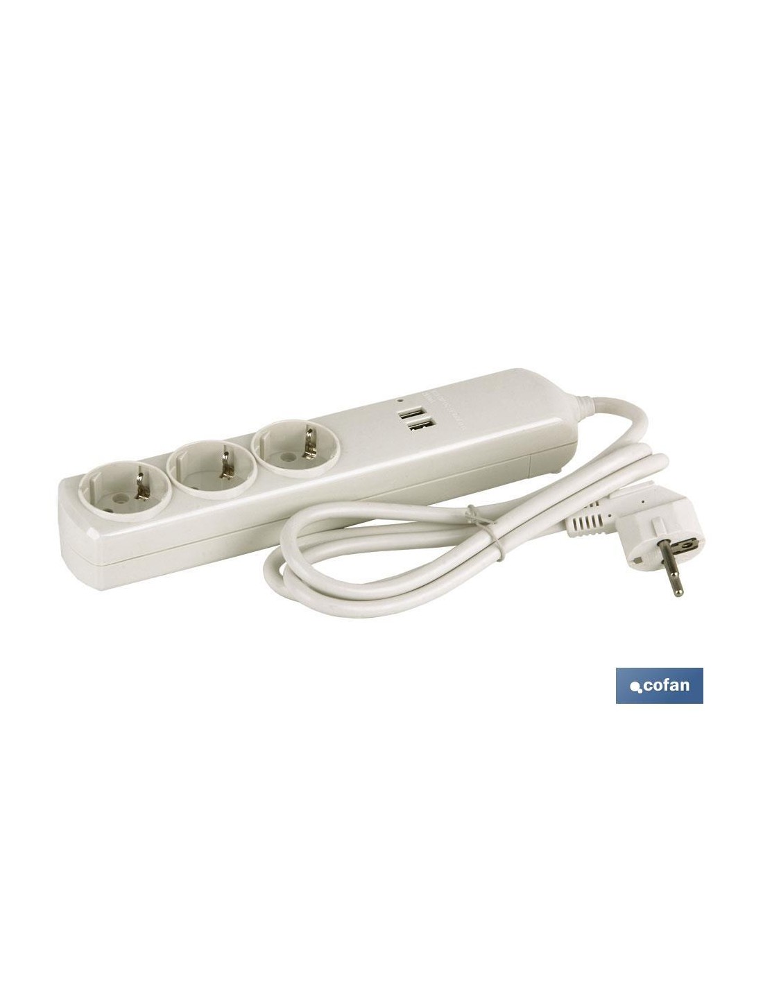 Base múltiple bipolar de 3 tomas de enchufe y prolongación de cable, con toma de tierra lateral y 2 puertos USB. Longitud del cable de 1,5 metros. 16 A - 250 V. 3680 W Máxima potencia. Color blanco.