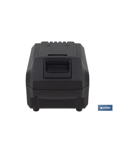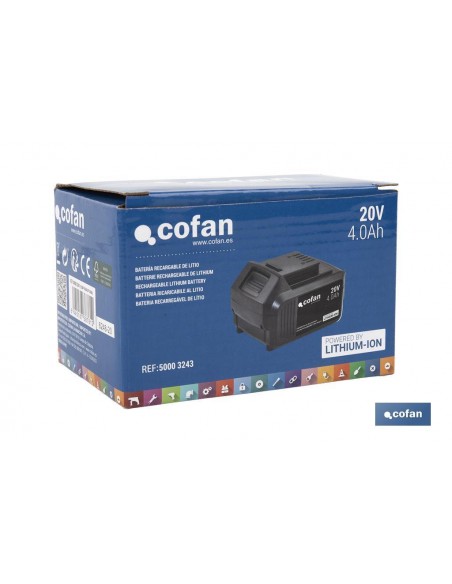 Batería recargable Li-ion de 20 V y 4.0 Ah diseñada exclusivamente para el sistema 1 For-All de herramientas Cofan. Esta batería está perfectamente adaptada para ser utilizada con todas las herramientas a batería de 20 V de Cofan, garantizando compatibilidad y eficiencia sin igual. Su tecnología avanzada de iones de litio ofrece una alta capacidad de carga y baja autodescarga, lo que significa que puedes trabajar más tiempo sin preocuparte por la pérdida de energía. Además, esta tecnología elimina el efecto de memoria, asegurando que la batería mantenga su máxima capacidad de carga tras cada uso. Equipada con sistema de protección que previene daños debido a sobrecargas, sobretensiones y cortocircuitos, extendiendo la vida útil del producto y asegurando un uso seguro en todo momento. Cuenta con un práctico indicador de nivel de carga que te permite monitorizar con precisión la energía restante para que nunca te quedes sin potencia inesperadamente.