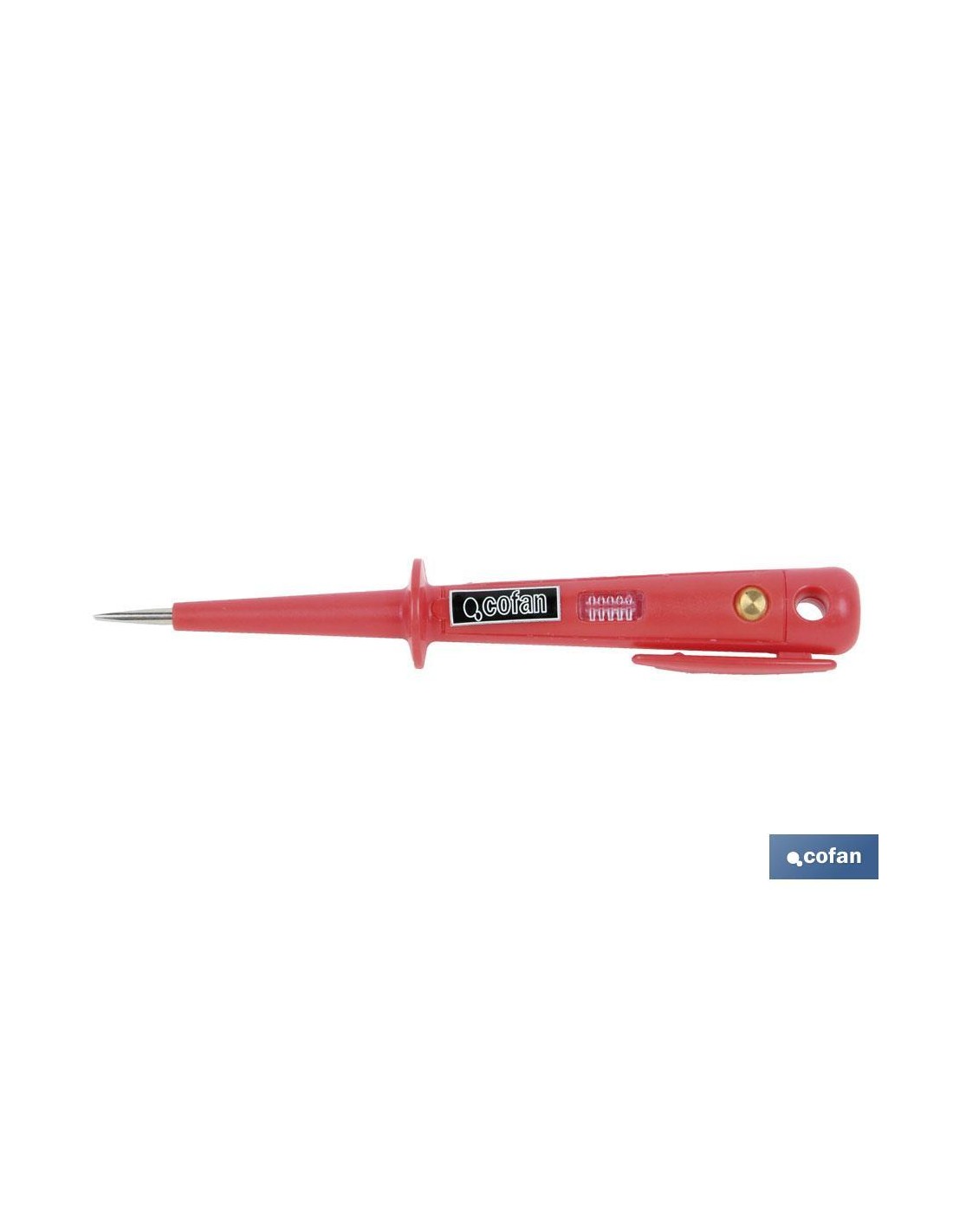 Buscapolos de bolsillo de color rojo. Incluye testigo de luz para facilitar su uso. Apto para medir tensiones desde 100 V hasta 250 V. Clip para sujetar la herramienta. Medidas entre 150 mm y 190 mm.