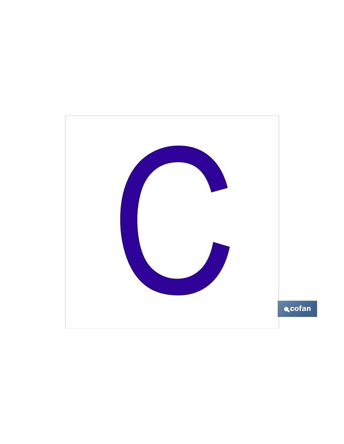 C Letra en glasspack adhesivo con el fondo blanco y carácter azul con medida en 62 x 62mm. El diseño de la señal puede variar, pero en ningún caso se variará el significado de la misma.