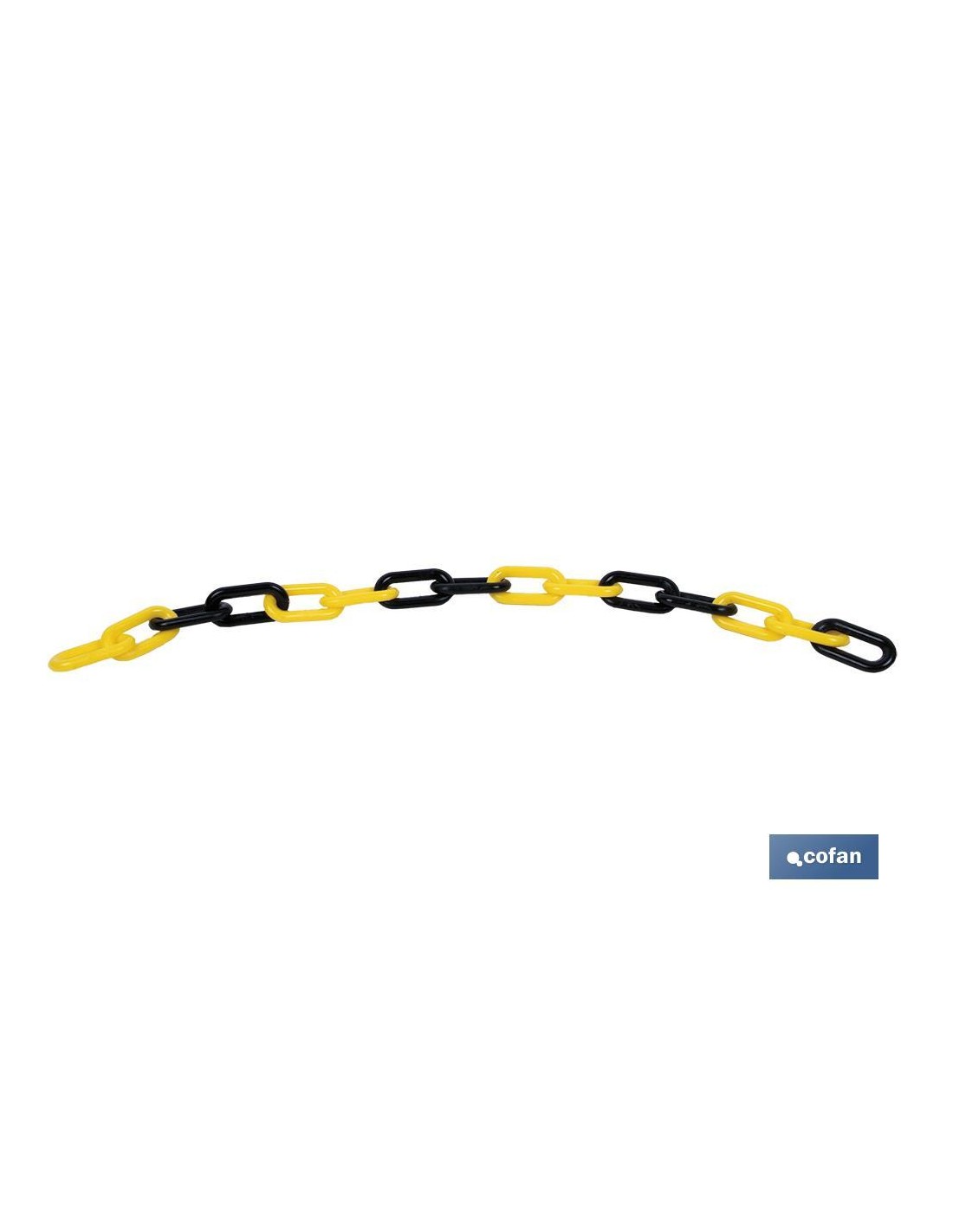 Cadena de plástico en color amarillo y negro, com medida en diámetro de 8mm. Disponible en rollos de 30 metros de longitud.