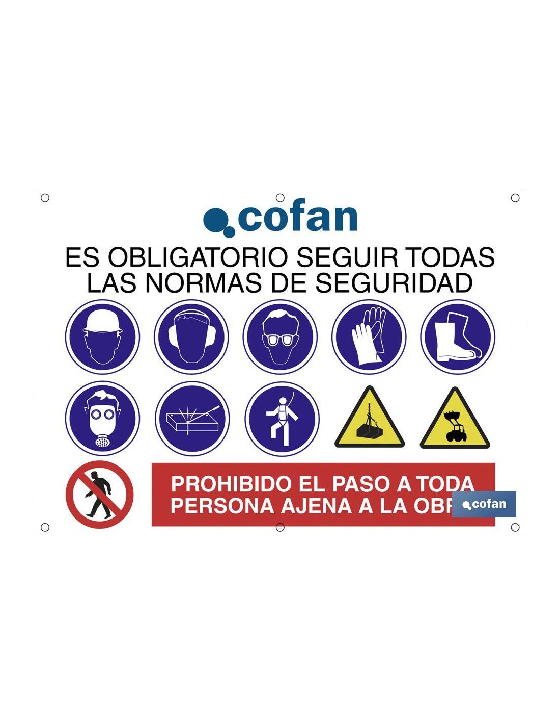 Cartel para obra en glasspack 0,7 mm. Es obligatorio seguir todas las normas de seguridad. Prohibido el paso a toda persona ajena a la obra.
