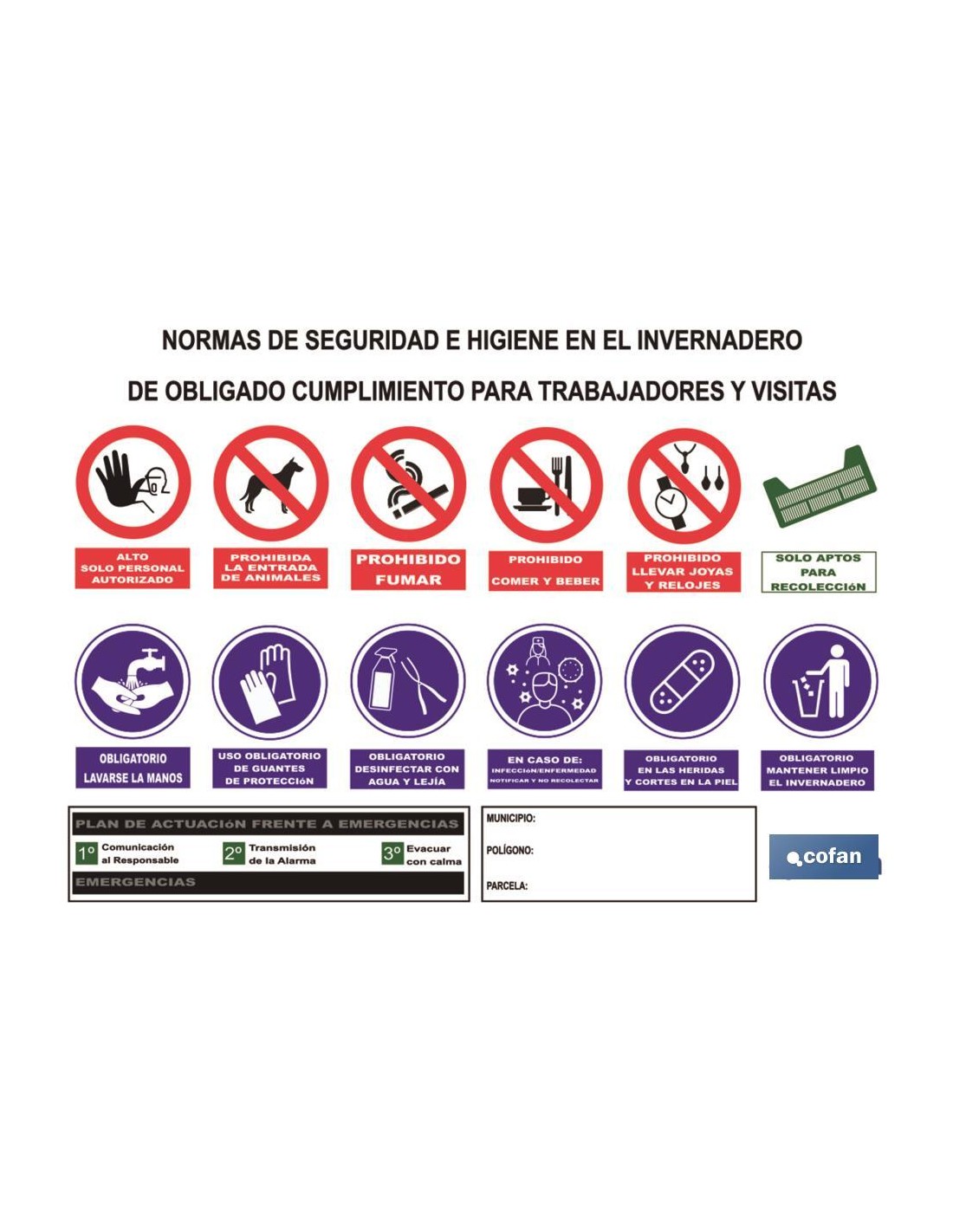 Cartel multiseñal para invernadero con normas de seguridad e higiene de obligado cumplimiento para trabajadores y visitas. Fabricado en Glasspack con medidas de 1000 x 700 mm. El diseño de la señal puede variar, pero en ningún caso se variará el significado de la misma.