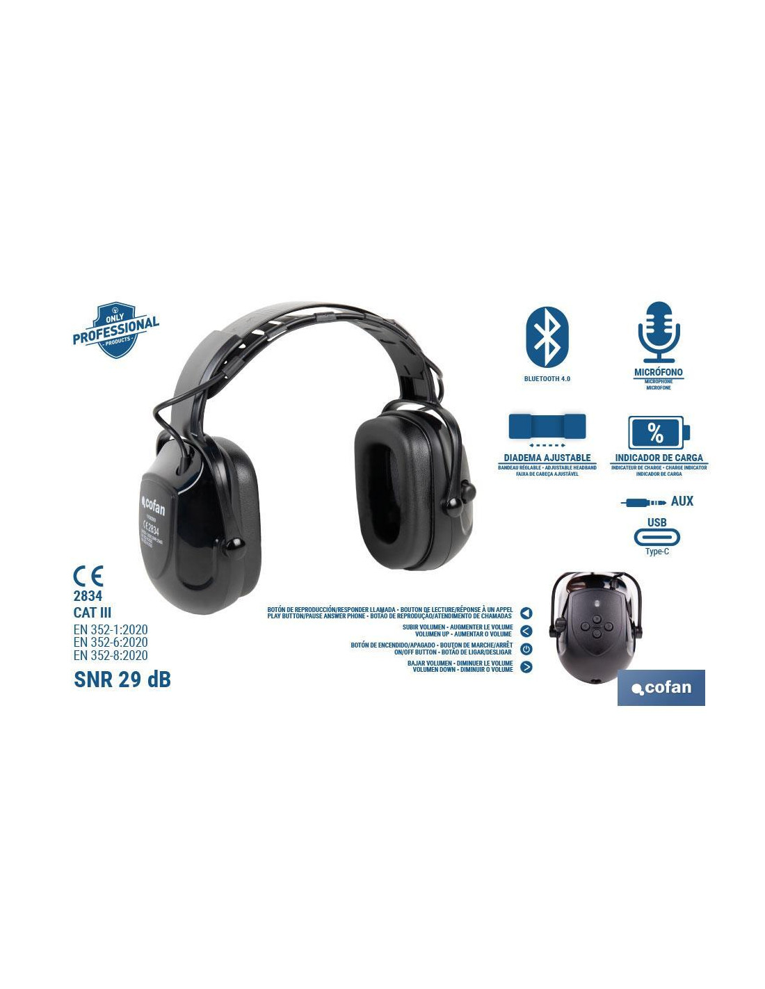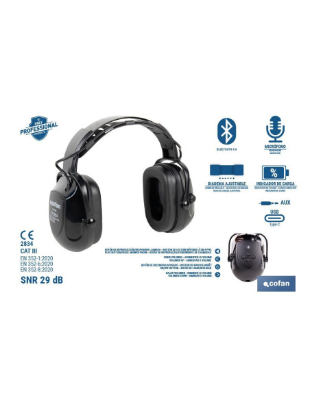 Los cascos antirruido SNR 29 dB con Bluetooth representan la combinación perfecta entre protección auditiva de alto rendimiento y la comodidad de la tecnología inalámbrica. Diseñados para profesionales que operan en entornos ruidosos, estos cascos no solo garantizan una reducción significativa del ruido, sino que también ofrecen la posibilidad de escuchar música, atender llamadas y disfrutar de la conectividad Bluetooth en cualquier situación.Con un nivel de reducción de ruido (SNR) de 29 dB, estos cascos están diseñados para proteger la audición en entornos con altos niveles de ruido. Son ideales para su uso en la industria, construcción, talleres y cualquier otro entorno donde el ruido pueda representar un riesgo para la salud auditiva.La conectividad Bluetooth 4.0 permite emparejar estos cascos con cualquier dispositivo compatible, como smartphones, tabletas o reproductores de música, con una distancia de hasta 10 metros. Esto facilita la escucha de música o la gestión de llamadas sin necesidad de cables, mejorando la movilidad y la comodidad durante su uso.Los cascos están equipados con un micrófono incorporado que permite responder llamadas de manera rápida y eficiente, incluso en entornos ruidosos. Además, los controles integrados permiten ajustar el volumen, cambiar de canción y gestionar llamadas directamente desde los cascos, sin necesidad de acceder al dispositivo.La diadema de los cascos es ajustable, para adaptarlos especialmente a cada sujeto.Estos cascos cuentan con una entrada AUX de 3,5 mm, lo que los hace compatibles con dispositivos más antiguos que no tienen Bluetooth. Además, se cargan a través de una entrada USB Tipo-C, que proporciona una carga rápida y eficiente. El indicador de carga te permite saber cuándo es el momento de recargar los cascos, evitando interrupciones durante el trabajo.Los cascos ofrecen hasta 8 horas de funcionamiento continuo, lo que los hace perfectos para jornadas de trabajo completas. El tiempo de carga es de solo 3,5 horas, lo que significa que estarán listos para usarse nuevamente en poco tiempo.Especificaciones Técnicas:Nivel de Reducción de Ruido (SNR): 29 dBBluetooth: 4.0, distancia hasta 10 mEntrada: AUX de 3,5 mmPuerto de Carga: USB Tipo-CDuración de la Batería: 8 horasTiempo de Carga: 3,5 horasEstos cascos cumplen con todas las normativas de seguridad más recientes (EN 352-1:2020, EN 352-6:2020, EN 352-8:2020)
