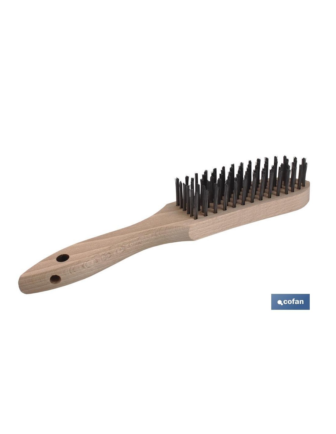 Cepillos de soldadura en acero con mango de madera. Cuenta con 3, 4, 5 o 6 filas de alambres en los cepillos.Cepillo manual soldador hecho con varias filas o hileras en acero al carbono Ø 0,35 mm, con mechones insertados en un mango de madera.Útil para la limpieza ligera de manchas y suciedad dura de superficies de metal y piedra.Eliminación de corrosión, óxidos, pinturas y adherencias desde superficies planas. Limpieza de soldaduras y limpieza manual en general.