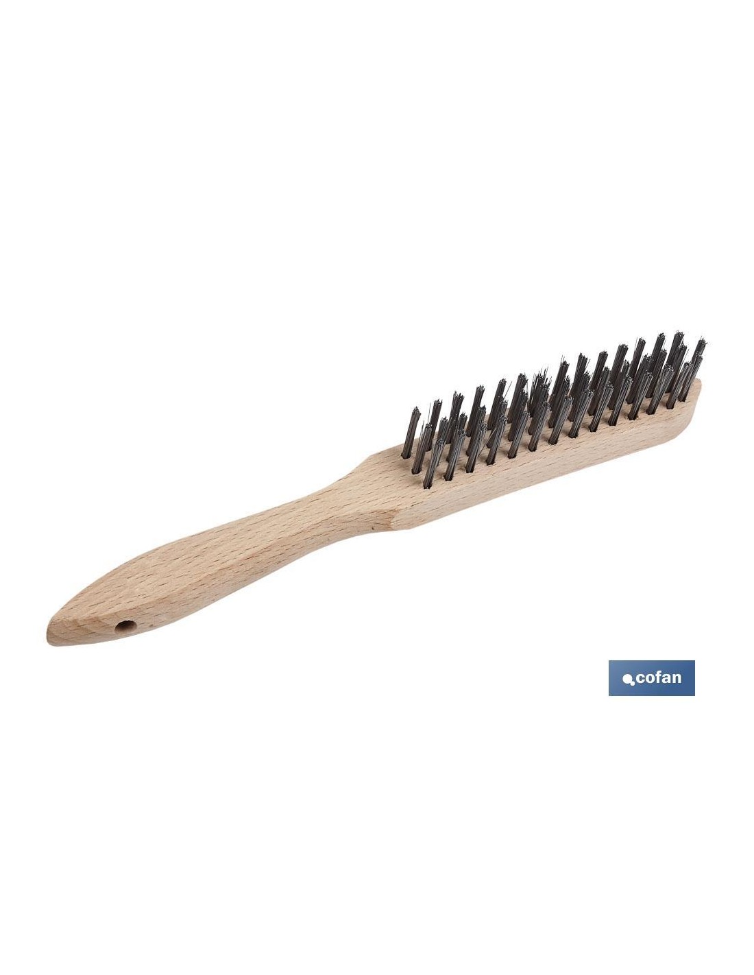 Cepillos de soldadura en acero con mango de madera. Cuenta con 3, 4, 5 o 6 filas de alambres en los cepillos.Cepillo manual soldador hecho con varias filas o hileras en acero al carbono Ø 0,35 mm, con mechones insertados en un mango de madera.Útil para la limpieza ligera de manchas y suciedad dura de superficies de metal y piedra.Eliminación de corrosión, óxidos, pinturas y adherencias desde superficies planas. Limpieza de soldaduras y limpieza manual en general.