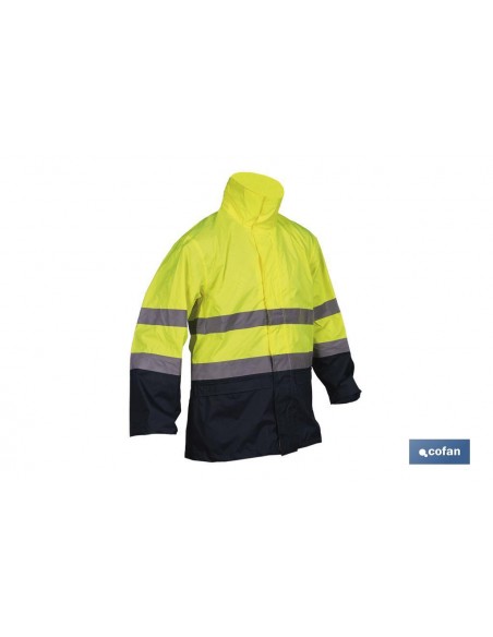 Chaqueta de alta visibilidad, modelo Sagitario, diseñada para enfrentar las inclemencias del tiempo en lugares con poca visibilidad. Fabricada en 100 % poliéster y con costuras termoselladas, esta chaqueta te ofrece una protección contra condiciones climatológicas adversas, como la lluvia, y te mantiene visible en condiciones de poca luz, gracias los colores amarillo y azul de la prenda. Su diseño, que se adapta fácilmente a todo tu cuerpo, cuenta con una capucha oculta en el cuello y una zona de ventilación en las axilas para garantizarte la comodidad durante largas jornadas de trabajo. También tiene un cierre central de cremallera y 2 bolsillos frontales, ocultos mediante una tapeta, para mantener tus pertenencias seguras y secas. La chaqueta cumple con las normas EN ISO 20471:2013+A1:2016 (Clase 3) y EN 343:2019. Disponible desde la talla S hasta la XXXL.