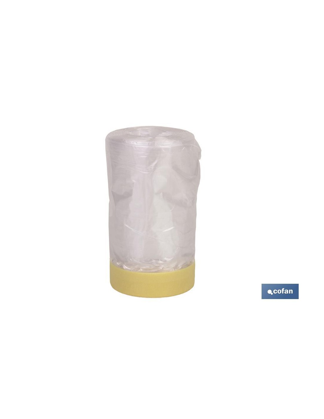 Rollo de cinta crepe con plástico protector translúcido ideal para proteger zonas delicadas del polvo. Cubra con este producto las zonas que desee proteger de la suciedad y residuos, como pueden ser las manchas de pintura, barniz o serrín y polvo en general. La cinta crepe con plástico protector puede utilizarse tanto en el ámbito de doméstico como en el profesional. Es totalmente válido para utilizarse en trabajos y procesos que en los que impliquen suciedad. Mediante el uso de este producto, podrás aislar elementos delicados y protegerlos de fluidos, polvo, residuos u otras sustancias que supongan una amenaza para estas zonas más vulnerables.