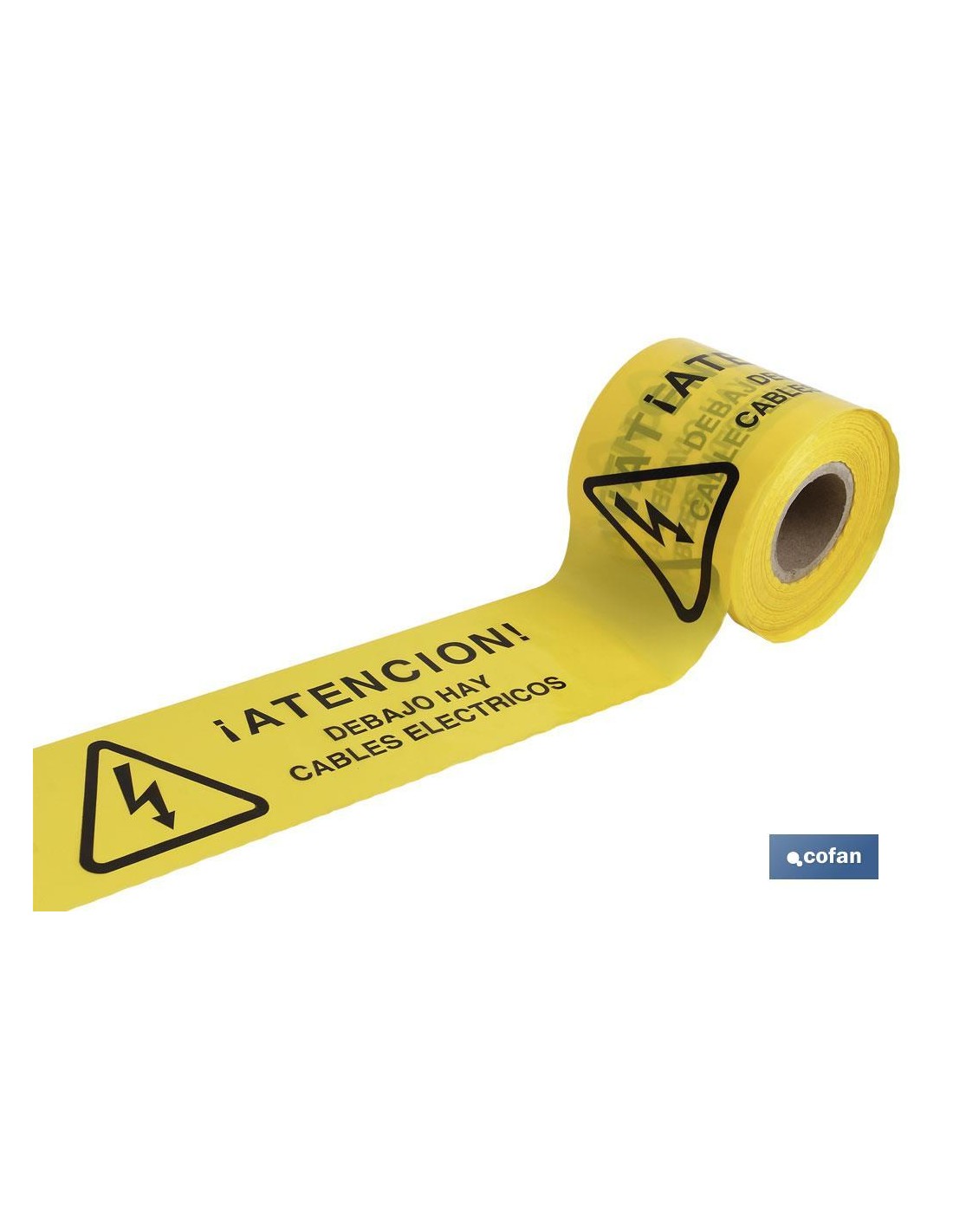 Cinta amarilla de balizamiento, cables eléctricos con galga de 300 y medidas de 150mm x 250 metros