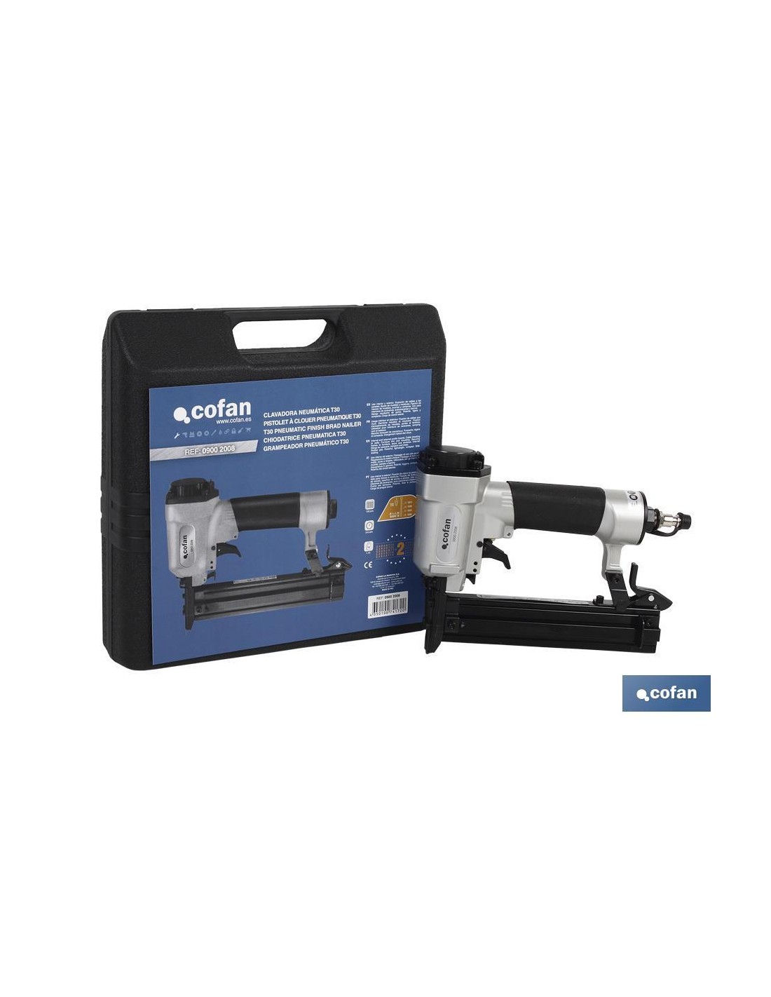 Clavadora neumática para clavos (TG) Ø 1 x1,25 mm, y longitud entre 15 y 30 mm. Muy práctica y útil en aplicaciones para bricolaje y profesional. Peso: 1,1 kg. El mango está envuelto con goma antideslizante.
