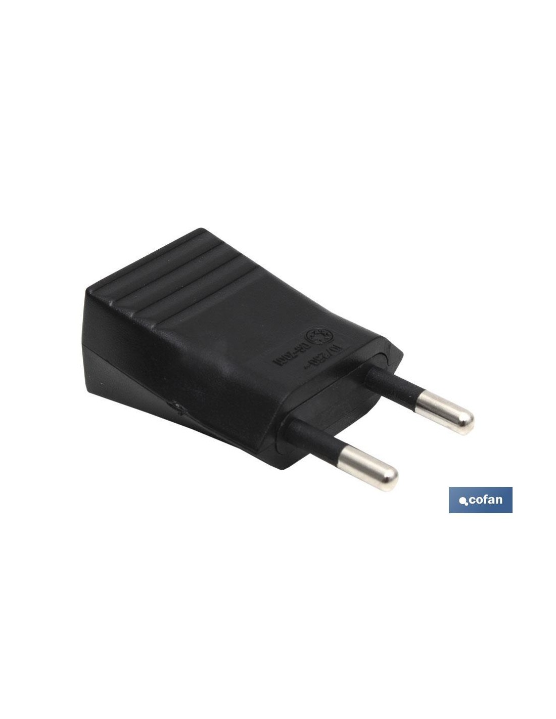 Clavija bipolar de 10 A Clase II, de espigas de 4 mm de Ø sin toma de tierra. 250 V~. Color negro. Material de fabricación termoplástico.