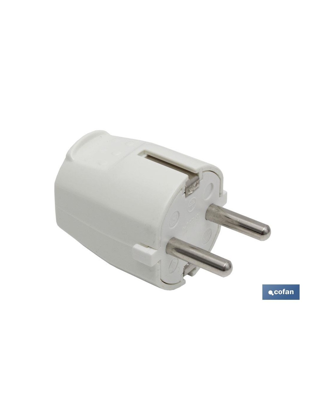 Clavija bipolar tipo Schuko de 16 A Clase II, sin toma de tierra. 250 V~. Potencia máxima: 3680 W. Colores blanco y negro.