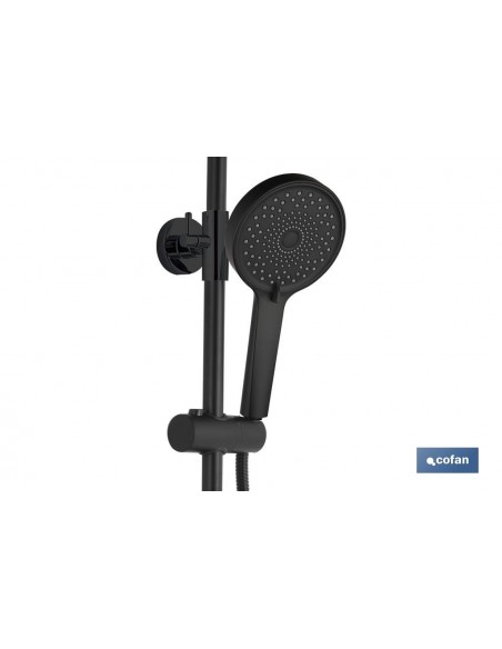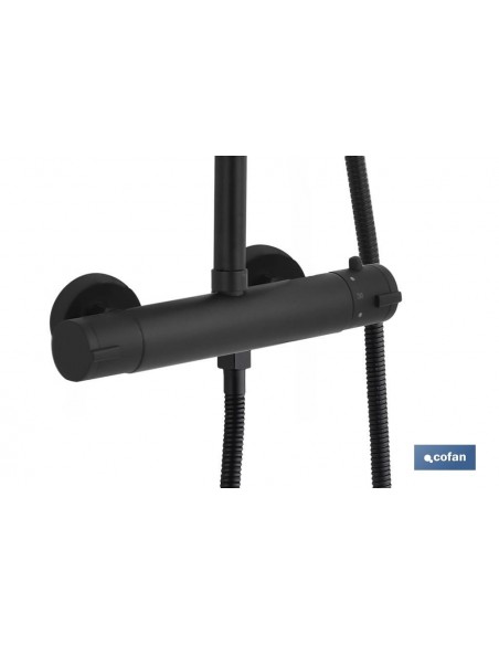 Columna de ducha extensible con grifo termostático en acabado negro mate.Se caracteriza por su sencillez, funcionalidad e innovación, ya que está pensada para hacer de la ducha, un placer diario. El cabezal de la ducha está fabricado en acero extraplano y es antical. Cuenta con dos filtros de ahorro de agua de 9 litros por minuto y una rótula de latón orientable. La barra telescópica, fabricada en acero, es regulable y extensible en altura (90 - 1,40 cm), e incluye un soporte para la pared. La ducha de mano tiene tres funciones: lluvia, lluvia suave y lluvia fuerte. Incluye un filtro de ahorro de agua de 9 litros por minuto y una rótula de latón orientable y también es antical. El flexo de ducha está fabricado en acero con un núcleo de latón y tubería interior de EPDM. El grifo termostático está fabricado en latón. Tiene muy buena resistencia a la abrasión y al desgaste. Medidas: barra telescópica: 90 - 140 cm con diámetro de 2 cm arriba y 2,4 cm abajo cabezal: 25 cm manguera: 1,5 - 1,8 m y mango: 26 cm x 12,5 cm.