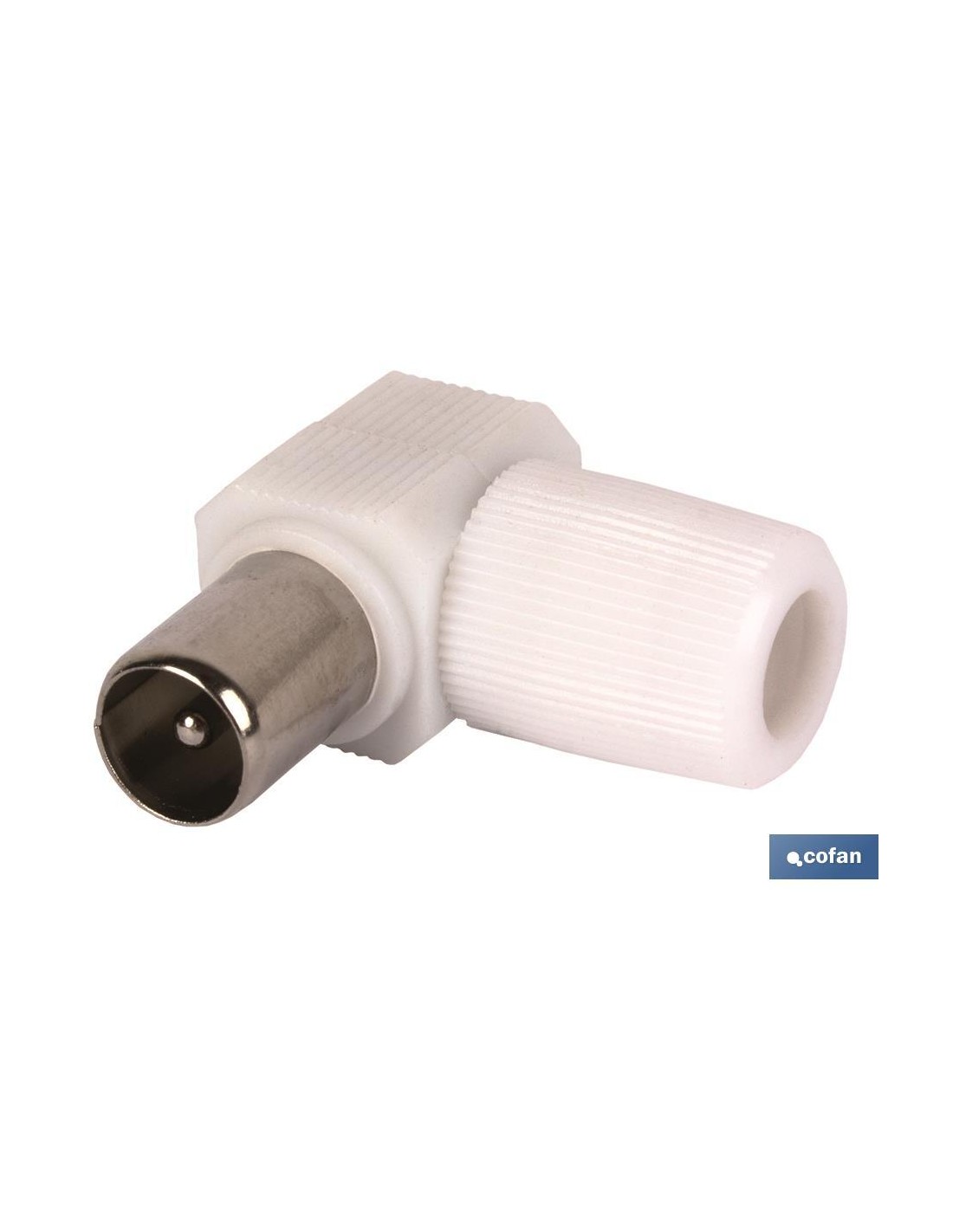 Conector adaptador de antena de televisión, en forma de codo, con salida de cable vía macho. Longitud total de la pieza de 9,5 mm. Apto para conectar la televisión mediante cable de antena.