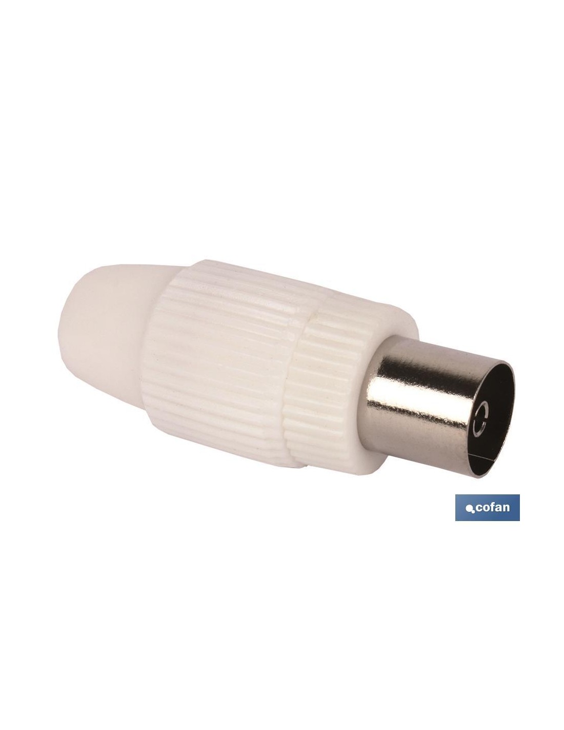Conector de antena de TV recto. Vías de entrada macho-hembra. Longitud 9,5 mm. Color Blanco. Se utiliza para conectar el cable de antena a la TV de diversas formas.