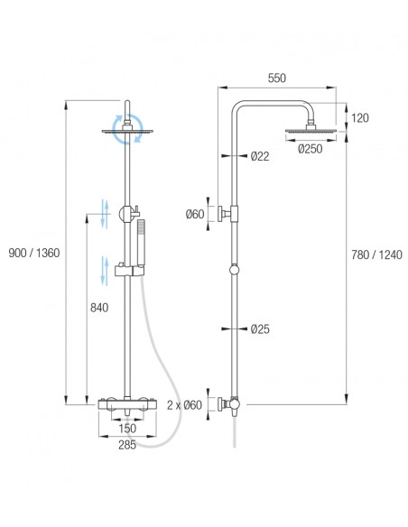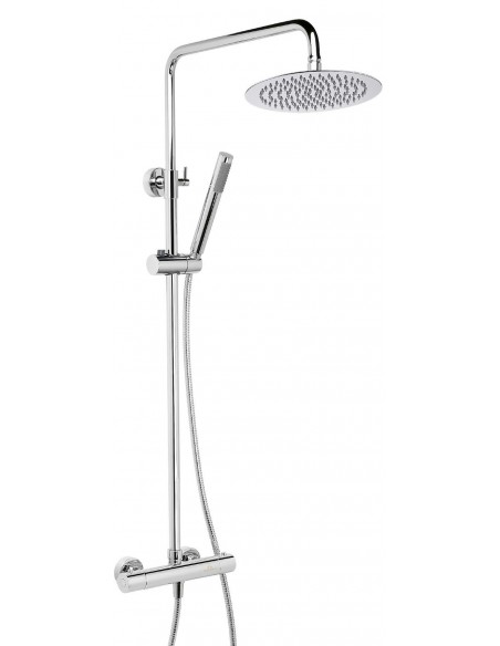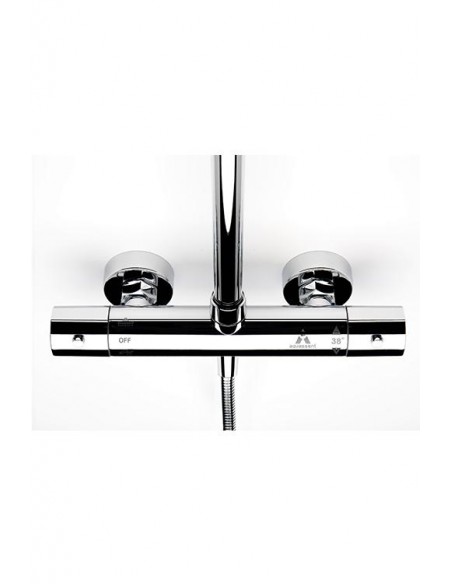 Grifería termostática fabricada en latón cromado incluye un cartucho Vernet. La barra es extensible de 78 / 124 cm de Acero Inox 304. Distribuidor 2 vías, rociador redondo extraplano de Ø25 cm, ducha de mano, efecto lluvia y anti-cal, flexo Acero Inox 304, extensible 150/180 cm.
