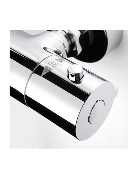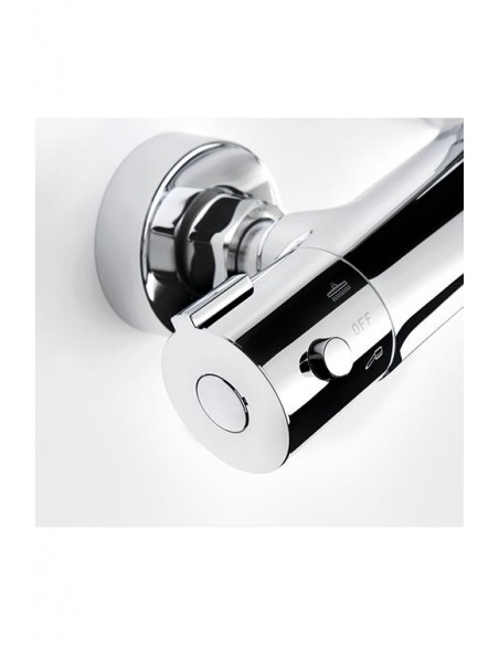 Minimalista conjunto ducha termostático, de formas cilíndricas, sin casi relieves y acabado cromo brillo.