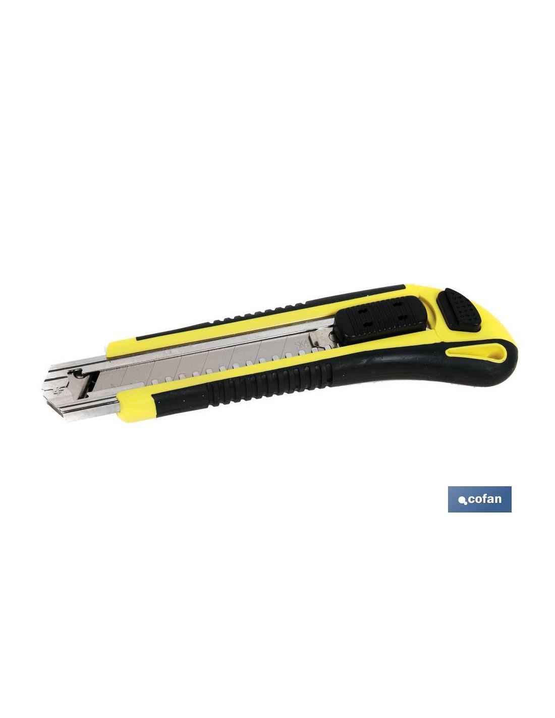 Cútter profesional con función de carga automática para trabajos exigentes e intensos. Diseñado con un orificio para poder conectar un mosquetón o enganche y transportarlo cómodamente. Fabricado con la máxima seguridad gracias al sistema de bloqueo automático de las cuchillas. El mango recubierto de goma blanda permite un agarre cómodo y ergonómico. Cada kit incluye un cútter con 3 cuchillas de recambio.