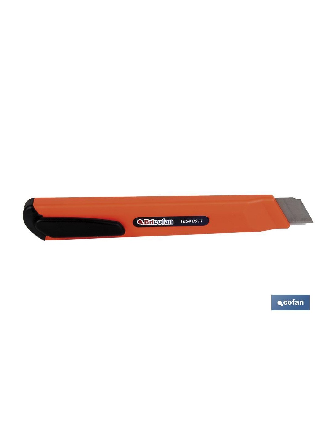 Cútter Estándar fabricado en ABS con función de carga automática para trabajos exigentes e intensos. Fabricado con la máxima seguridad gracias al sistema de bloqueo automático de las cuchillas. El mango recubierto d¡ permite un agarre cómodo y ergonómico. Incluye un sistema de seguridad que permite bloquear automáticamente la hoja de la guía.