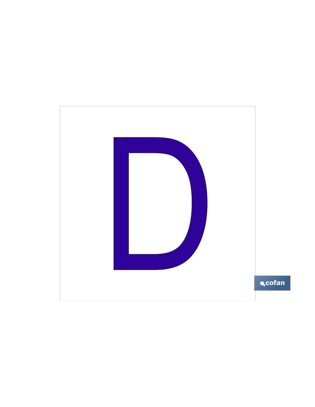 D Letra en glasspack adhesivo con el fondo blanco y carácter azul con medida en 62 x 62mm. El diseño de la señal puede variar, pero en ningún caso se variará el significado de la misma.