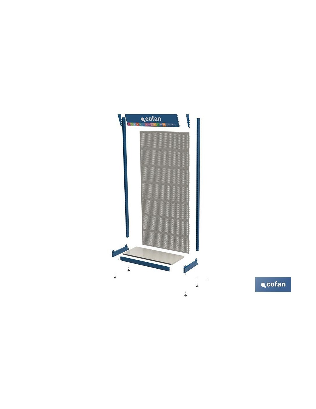 Despiece Expositor Perforado. Columna lateral, pie lateral, faldón delantero lama baja, fondo perforado, bandeja inferior, cartela con logo cofan.