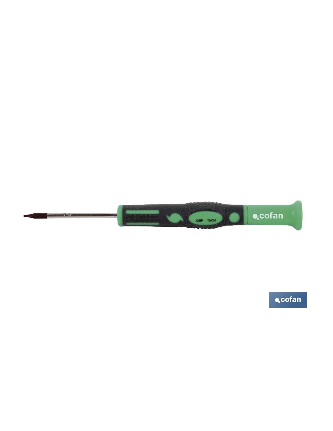 Destornillador de alta precisión torx con huella de Modelo T5 hasta T20, longitud de 50 mm sin mango y 148 mm longitud total. Material fabricado en cromo vanadio, con mango ergonómico de goma para facilitar su uso. Es ideal para trabajos técnicos muy precisos y de electrónica.