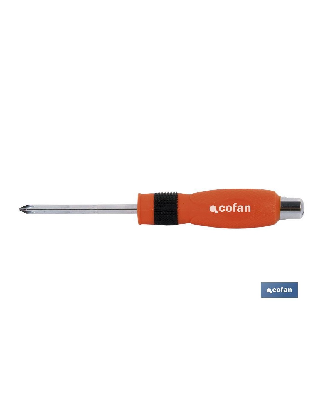 Destornillador Phillips de impacto con huella Phillips de PH-1, PH-2 y PH-3. Hecho en acero cromado. Contiene un saliente para el golpeo y partes planas para añadir herramientas en caso de hacer giros forzados. Ideal para aplicaciones donde se requiere de un destornillador de altas prestaciones. El mango es de agarre antideslizante y cómodo. Fabricado en acero cromo molibdeno y vanadio con la varilla cromada aseguran la durabilidad del destornillador. El material del mango y de la varilla aseguran una alta resistencia a palancas y golpeos.
