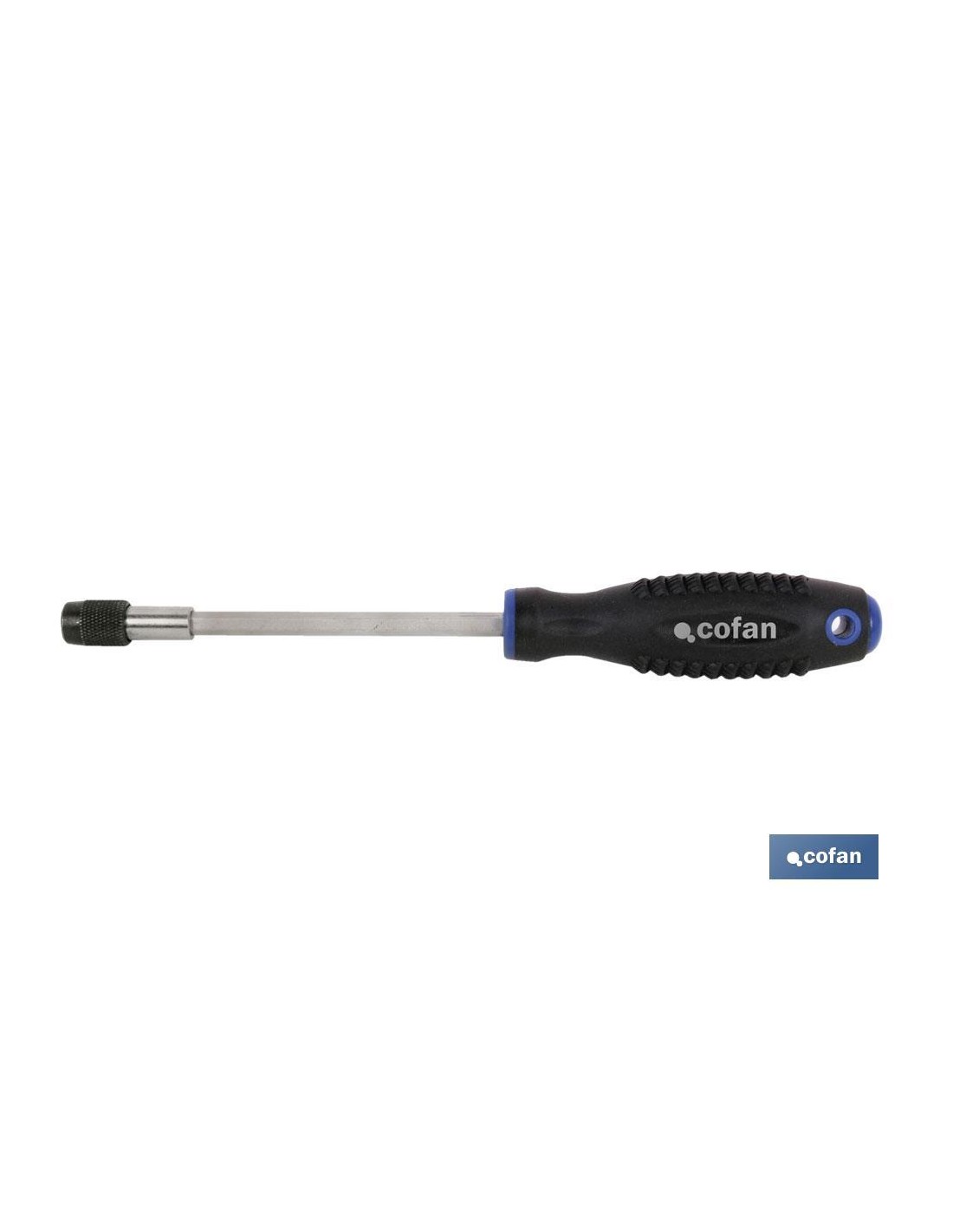 Destornillador rígido para puntas de 1/4 modelo Confort plus, con porta puntas de cambio rápido, 24 centímetros de longitud total. Con una punta de cambio rápido de puntas para que estas no se pierdan. Puedes ahorrar mucho tiempo en la inserción de tornillos. El mango es de agarre antideslizante y cómodo. Fabricado en acero cromo vanadio y molibdeno con la varilla cromada que aseguran la durabilidad del destornillador. El material termoplástico asegura la resistencia al deslizamiento y el alto rendimiento de la empuñadura.