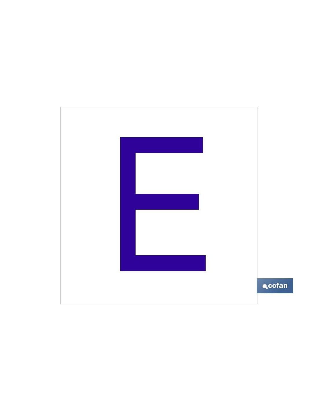 E Letra en glasspack adhesivo con el fondo blanco y carácter azul con medida en 62 x 62mm. El diseño de la señal puede variar, pero en ningún caso se variará el significado de la misma.