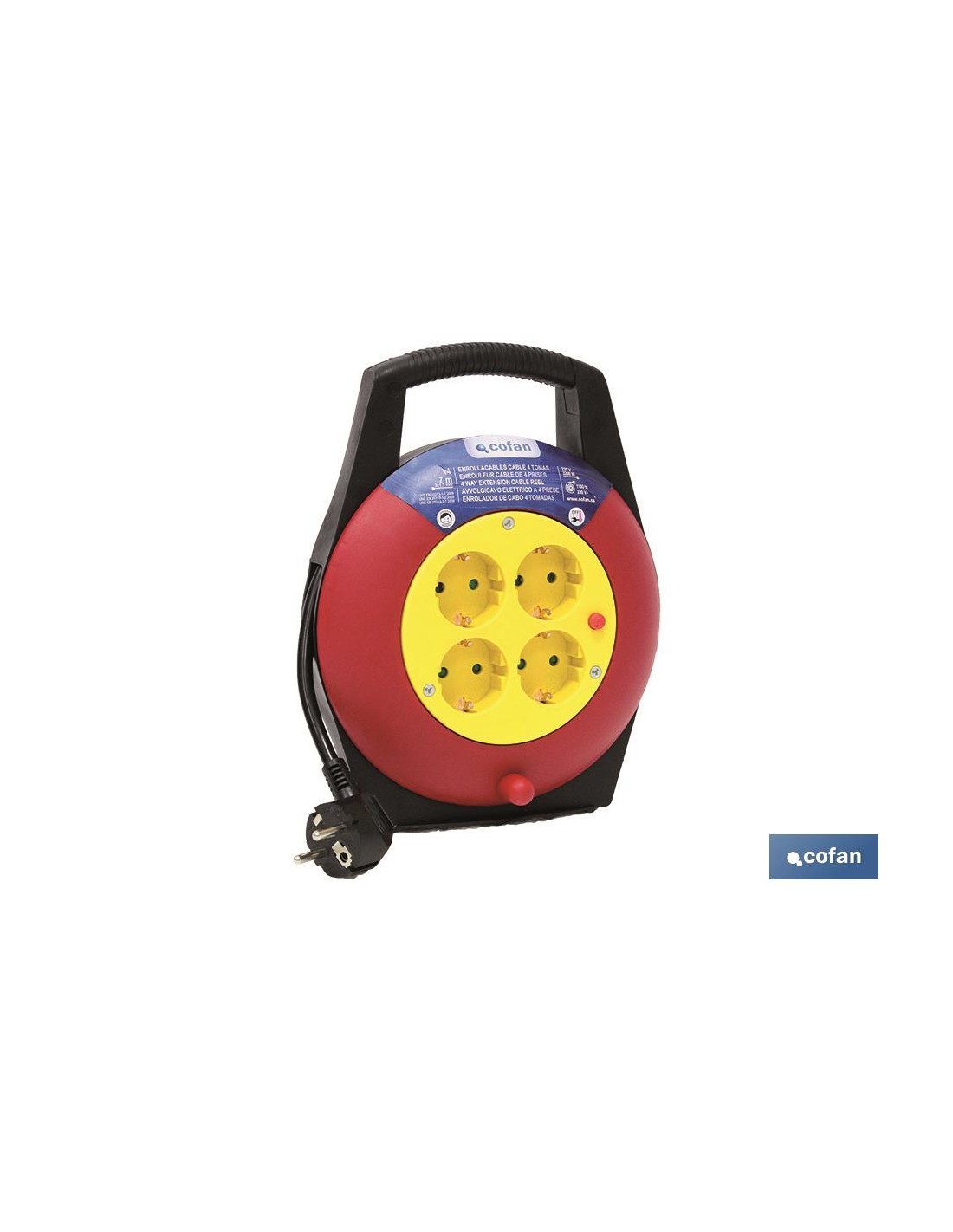 Enrollacables eléctrico con cuatro tomas o enchufes y 7 metros de longitud. Enrollacables provisto de conmutador de seguridad por sobrecarga, seguridad para niños. Tambor enrollador de cable de 7 metros de largo y sección de 3 x 1,5 mm.