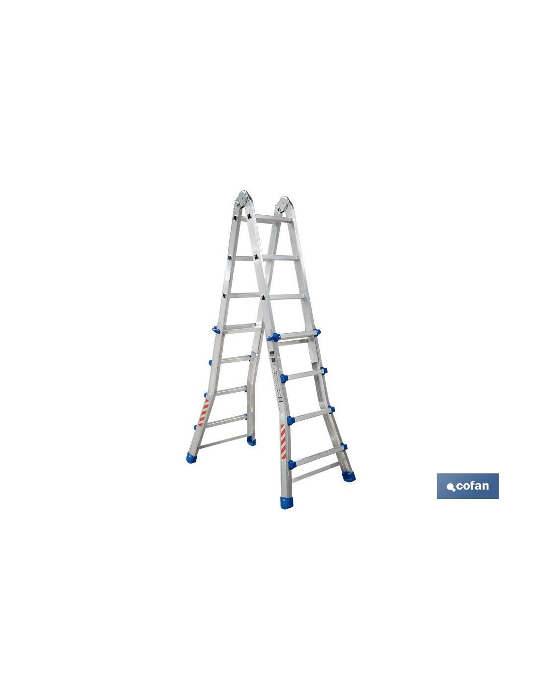 Escaleras multiposición de aluminio con certificado EN131 y resistencia a 150 kilogramos máximo. Esta escalera está disponible con 3, 4 o 5 peldaños en cada tramo. El ancho del tramo es de 38 cm. Está reforzada por bisagras y asegurada por cierres de seguridad. La forma de la escalera proporciona una excelente estabilidad, con mayor apertura en los extremos, pies antideslizantes y escalones acanalados. Es ideal para pintar paredes, colgar luces, limpiar aleros, etc.