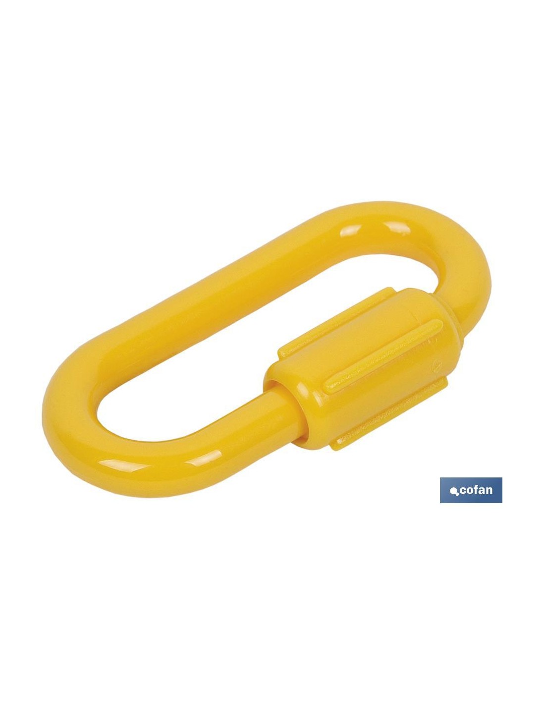 Eslabon de plástico amarillo, ideal para hacer uniones de cadenas de plástico. Cierre roscado en el lateral de la malla de unión amarilla.