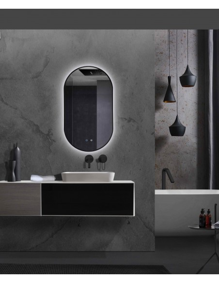 Espejo elíptico, retroiluminado, triled (cálida, neutra y fría) con doble sensor anti-vaho y on/off, con premarco.