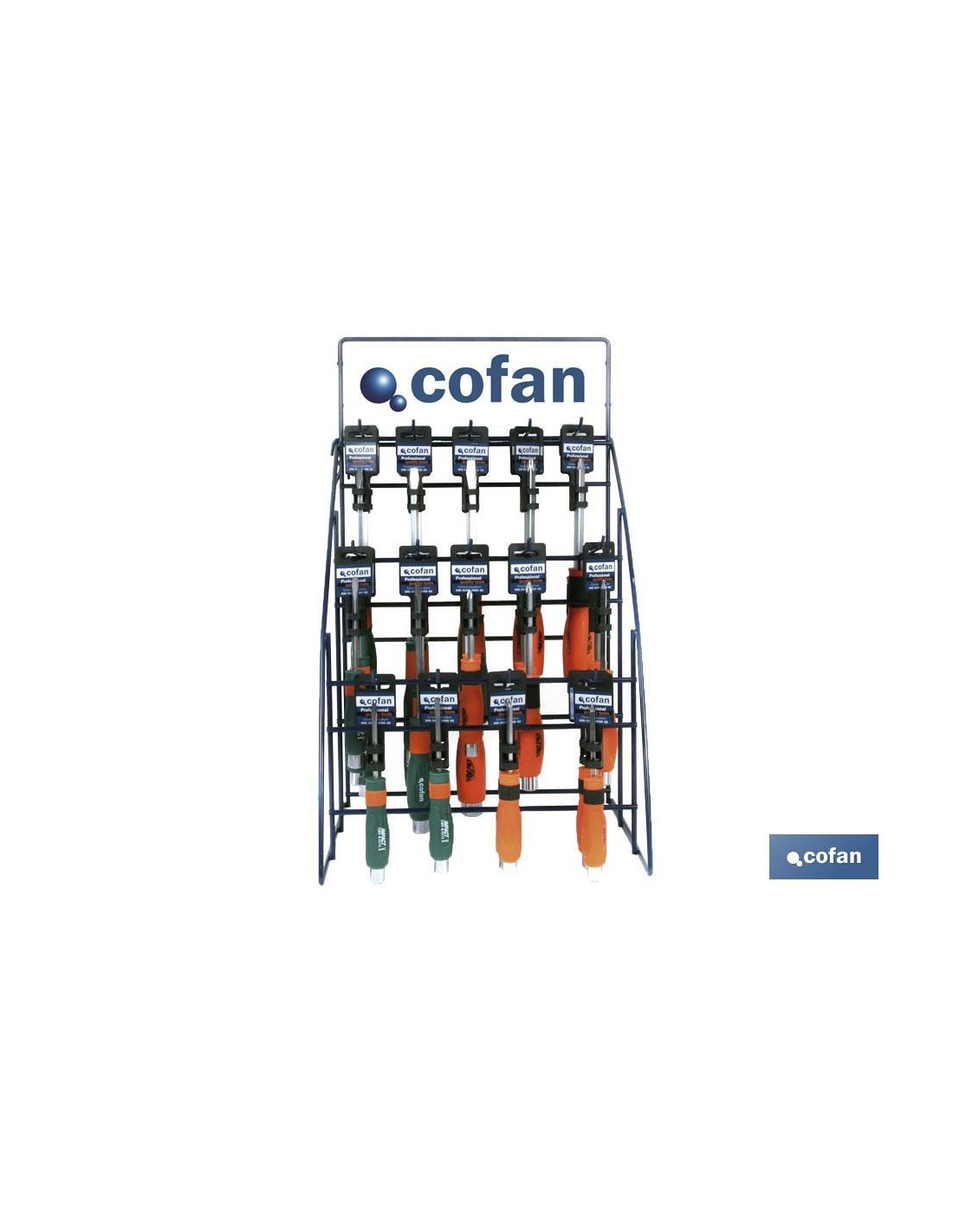 Expositor de destornilladores de impacto con 45 unidades variadas, dispone de unidades variadas en philips, planos y pozidrive.